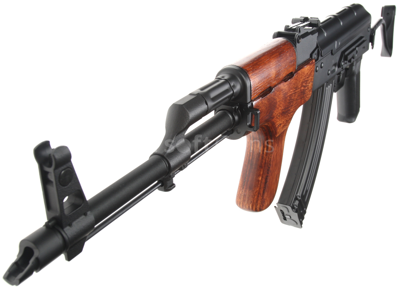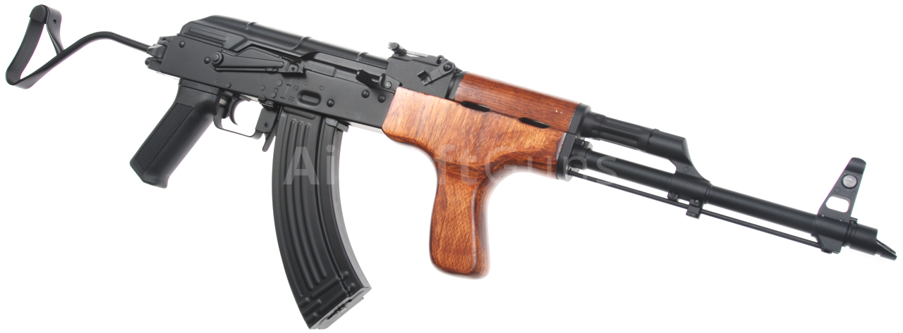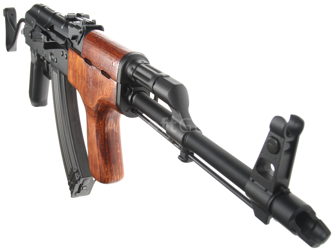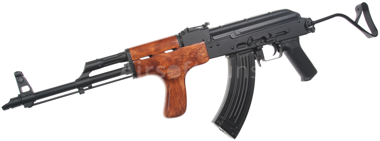 Více informacíAK-47 AIMS, dřevo, ocel, EBB, Cyma Standard, CM.050. Elektrická airsoftová zbraň. Replika modelu AK-47 AIMS [CM.050] Cyma Standard Edition s ocelovým(!!!) tělem, krytem závěru, kompenzátorem a sklopnou pažbou. Předpažbí zbraně je velice zdařile vyrobené z pravého laminovaného dřeva, tedy žádná plastová imitace pro maximální napodobení palné zbraně. Stavitelná mířidla, plynové potrubí, vnější hlaveň, přední úchyt na popruh a další části jsou také kovové. Akumulátor, v případě této verze se sklopnou pažbou, se vkládá pod plechový kryt závěru, tedy do prostoru nad mechabox.