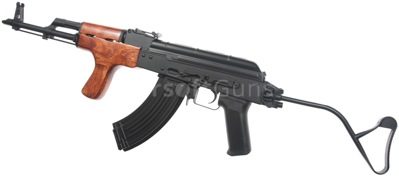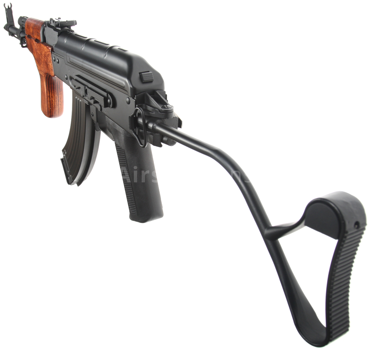 Replika je vybavena EBB (electric blow back) systémem, který napodobuje pohyb závěru a zpětný ráz zbraně při střelbě. Na levé straně těla je kovová boční montážní lišta, pomocí které lze na zbraň snadno nasunout boční bázi AK s optikou nebo kolimátorem. Tento model zbraně má bočně sklopnou pažbu nezvykle na pravou stranu. Proto lze nosit připevněný zaměřovač i se sklopenou pažbou a specifický design pažby dovoluje pohodlný přístup na páku přepínání režimu střelby.