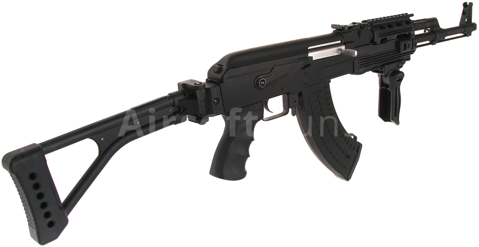 Elektrická airsoftová zbraň. Replika modelu AK-47 RIS Tactical [CM.028U] Cyma Sport Edition s plastovým tělem. Moderně zpracovaná verze s ergonomickou pažbičkou a RIS předpažbím, které umožňuje použití taktického příslušenství. Vnější hlaveň, plynové potrubí, kryt závěru, stavitelná mířidla, úchyt na popruh, lučík a další dílky jsou kovové. Model Tactical se vyznačuje bočně sklopnou pažbou, a proto se akumulátor vkládá pod kryt závěru.