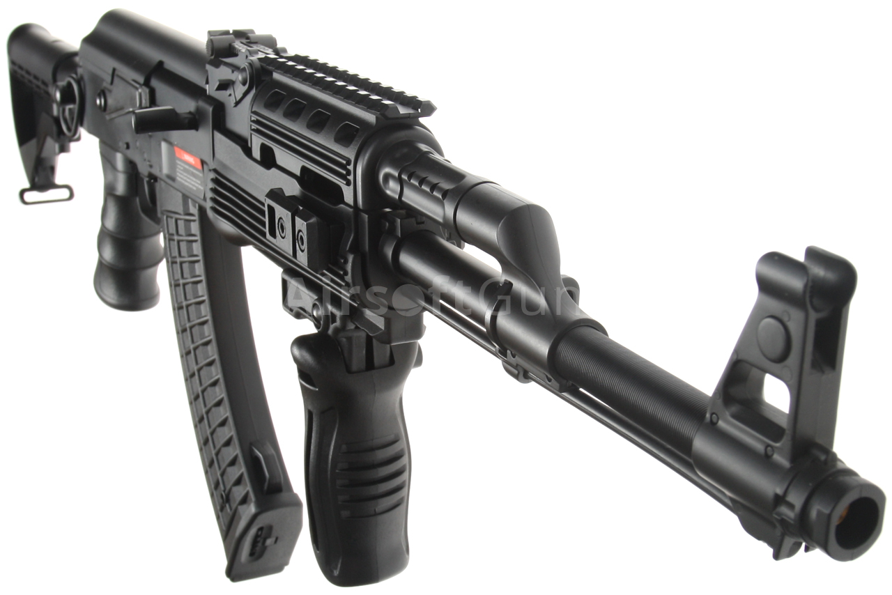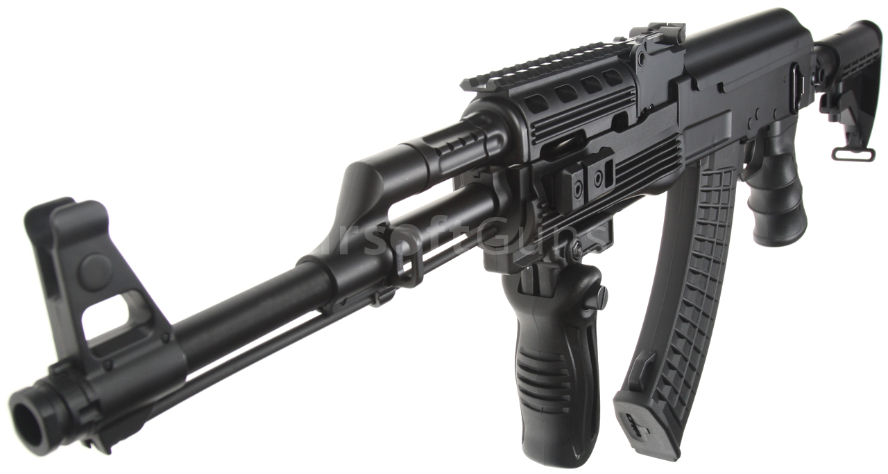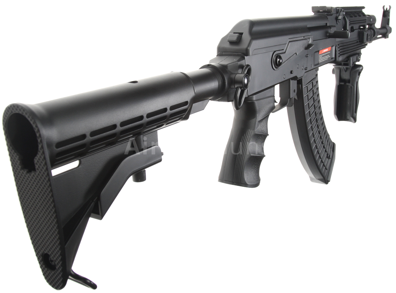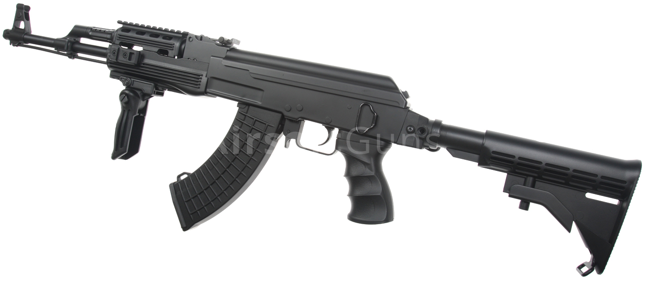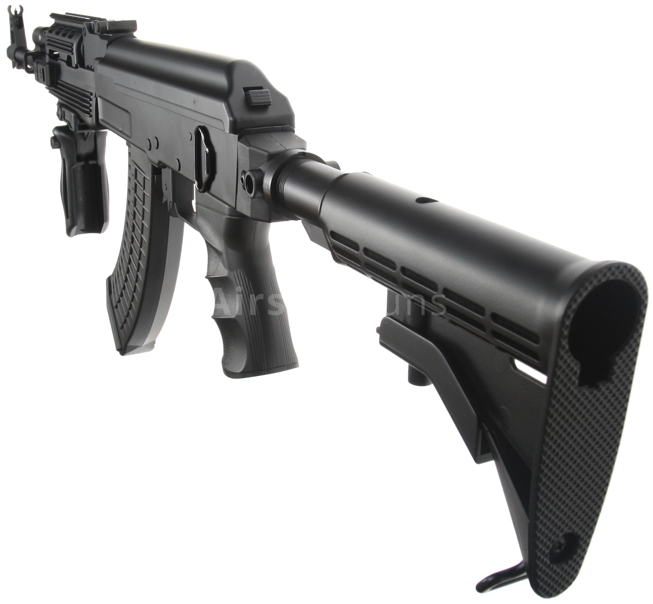 AK-47 RIS Tactical, Cyma Sport, CM.522C. Elektrická airsoftová zbraň. Replika modelu AK-47 RIS Tactical [CM.522C] Cyma Sport Edition s plastovým tělem. Moderně zpracovaná verze s ergonomickou pažbičkou a RIS předpažbím, které umožňuje použití taktického příslušenství. Tato varianta modelu Tactical se vyznačuje teleskopickou zásuvnou pažbou typu M4. Akumulátor se vkládá pod kryt závěru. Jedná se o zbraň, která je vhodná převážně pro začátečníky nebo děti. Většina vnějších dílů je vyrobená z plastu a tak je hmotnost zbraně daleko nižší než u celokovových modelů. Se zbraní tak zvládnou snadno manipulovat i menší děti, pro které je vysoká váha celokovových modelů mimo jejich fyzické schopnosti.