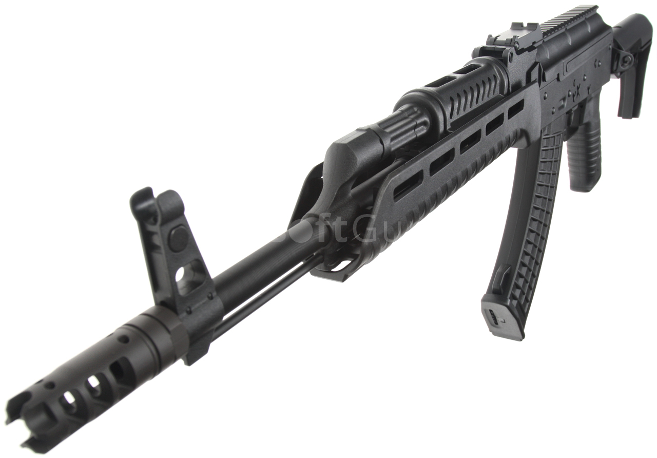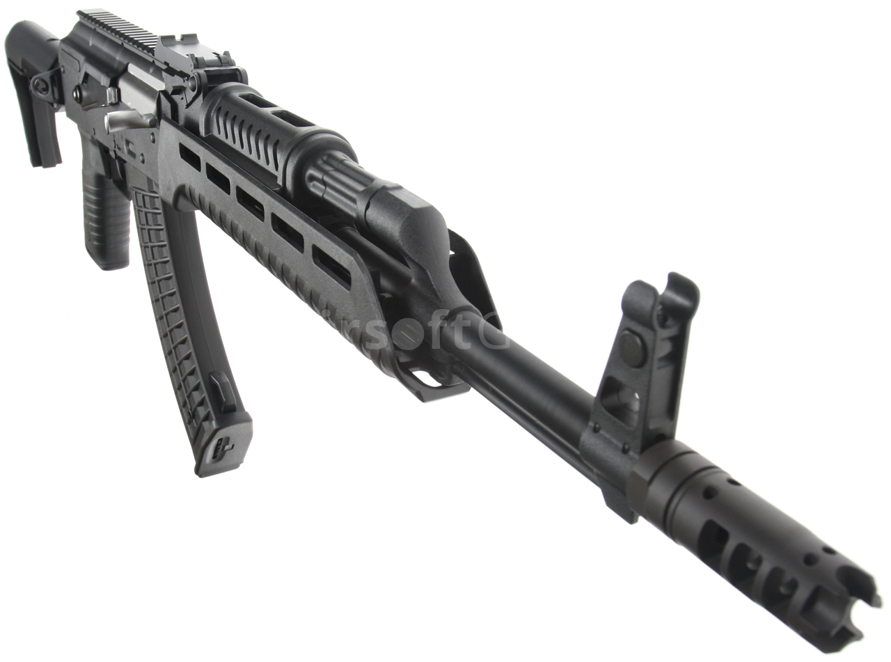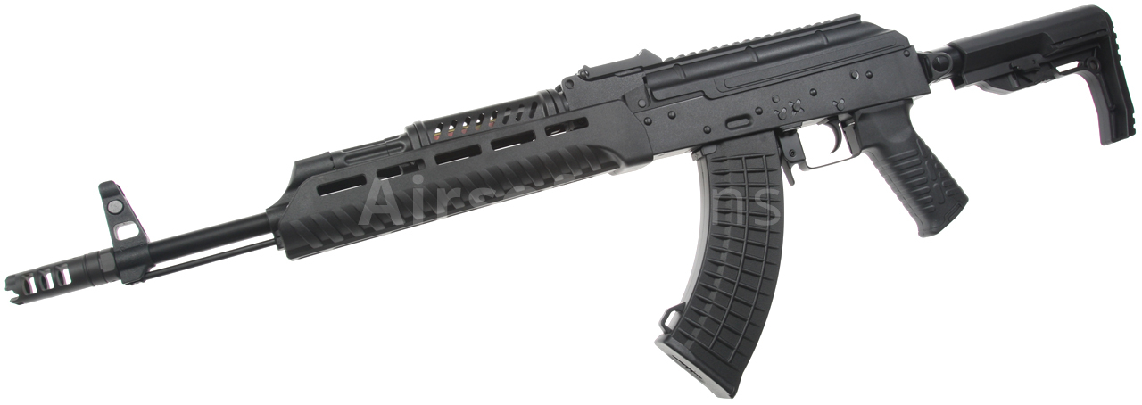 Více informacíAKM ZH, zásuvná pažba M4, nylon, Black, Cyma Sport, CM.680G. Elektrická airsoftová zbraň. Replika modelu AKM ZH [CM.680G] Cyma Sport Edition v moderní konfiguraci s nylonovým tělem a zásuvnou pažbou M4. K výrobě většiny vnějších dílů byl použitý pevný nylon plast obohacený o skelné vlákno, které slouží jako výztuž. Z kovu je však celá vnější hlaveň a RIS lišta na krytu závěru. Hmotnost zbraně je daleko nižší než u celokovových modelů a se zbraní se tak lépe manipuluje. Jedná se o pevnou a dobře zpracovanou zbraň, která je vhodná převážně pro začínající střelce. Akumulátor se v případě této repliky vkládá pod kryt závěru, tedy do prostoru nad mechabox. Zbraň je osazena moderními doplňky, které napodobují Magpul Zhukov styl.