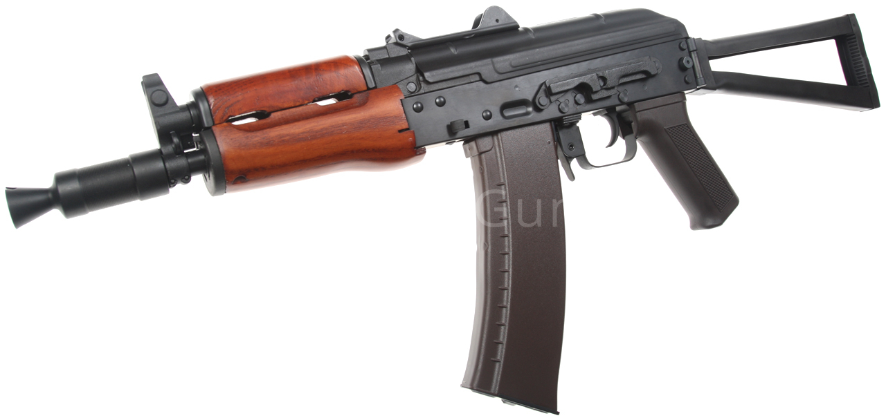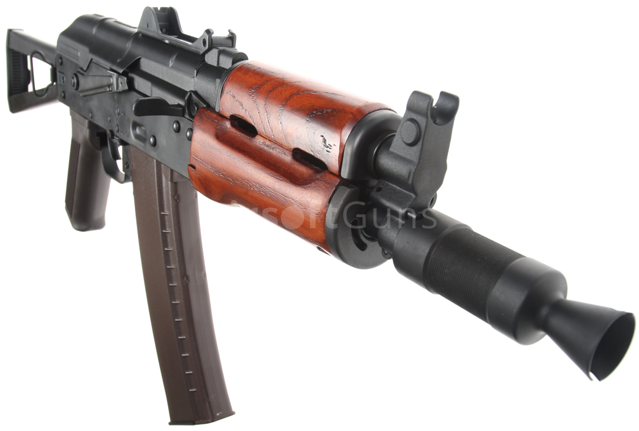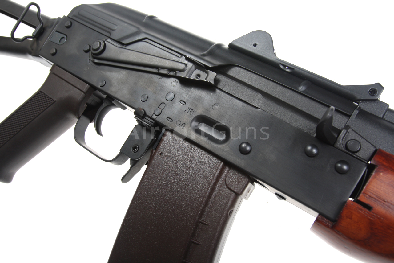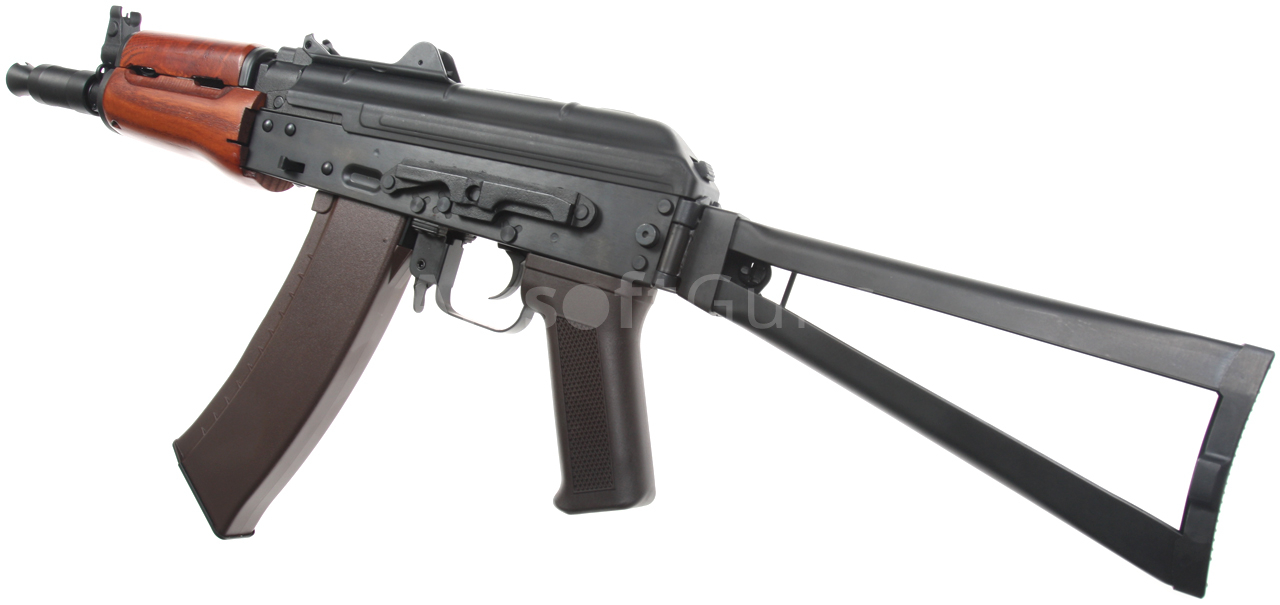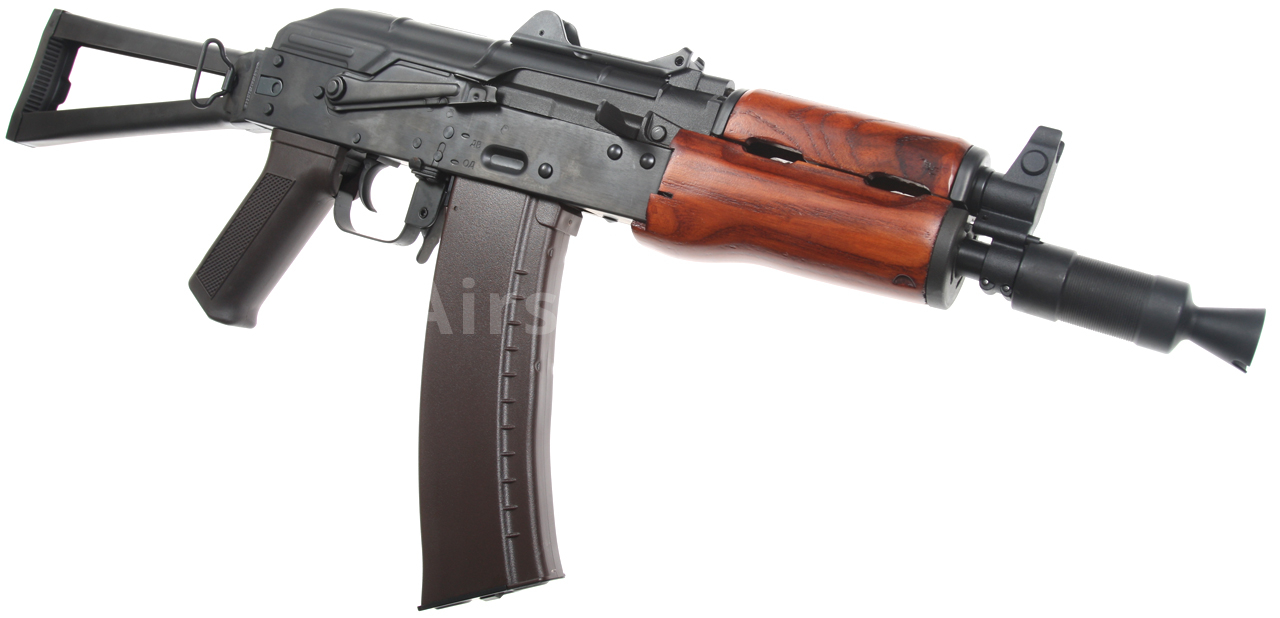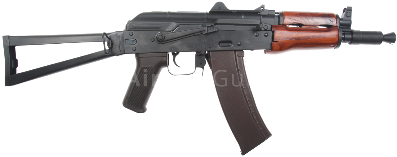 Airsoftová replika ruské legendární zbraně AKS-74U je vybavena bočně sklopnou pažbou, plně seřiditelnými mířidly, úchyty na popruh a robustním kompenzátorem, to vše je samozřejmě ocelové. Na levé straně těla je boční montážní lišta, pomocí které lze na zbraň snadno nasunout boční bázi AK s optikou nebo kolimátorem. Akumulátor se v případě této verze vkládá pod plechový kryt závěru, tedy do prostoru nad mechabox. Provedení je celo ocelové, takže z pevného polymeru naleznete pouze pažbičku a zásobník. Předpažbí je vyrobené z pravého dřeva.
