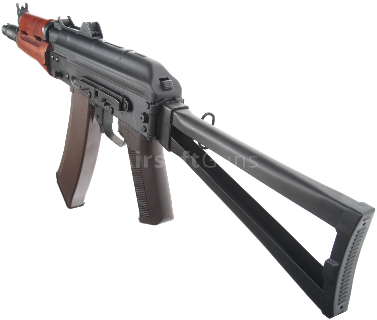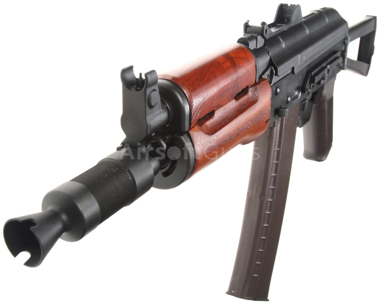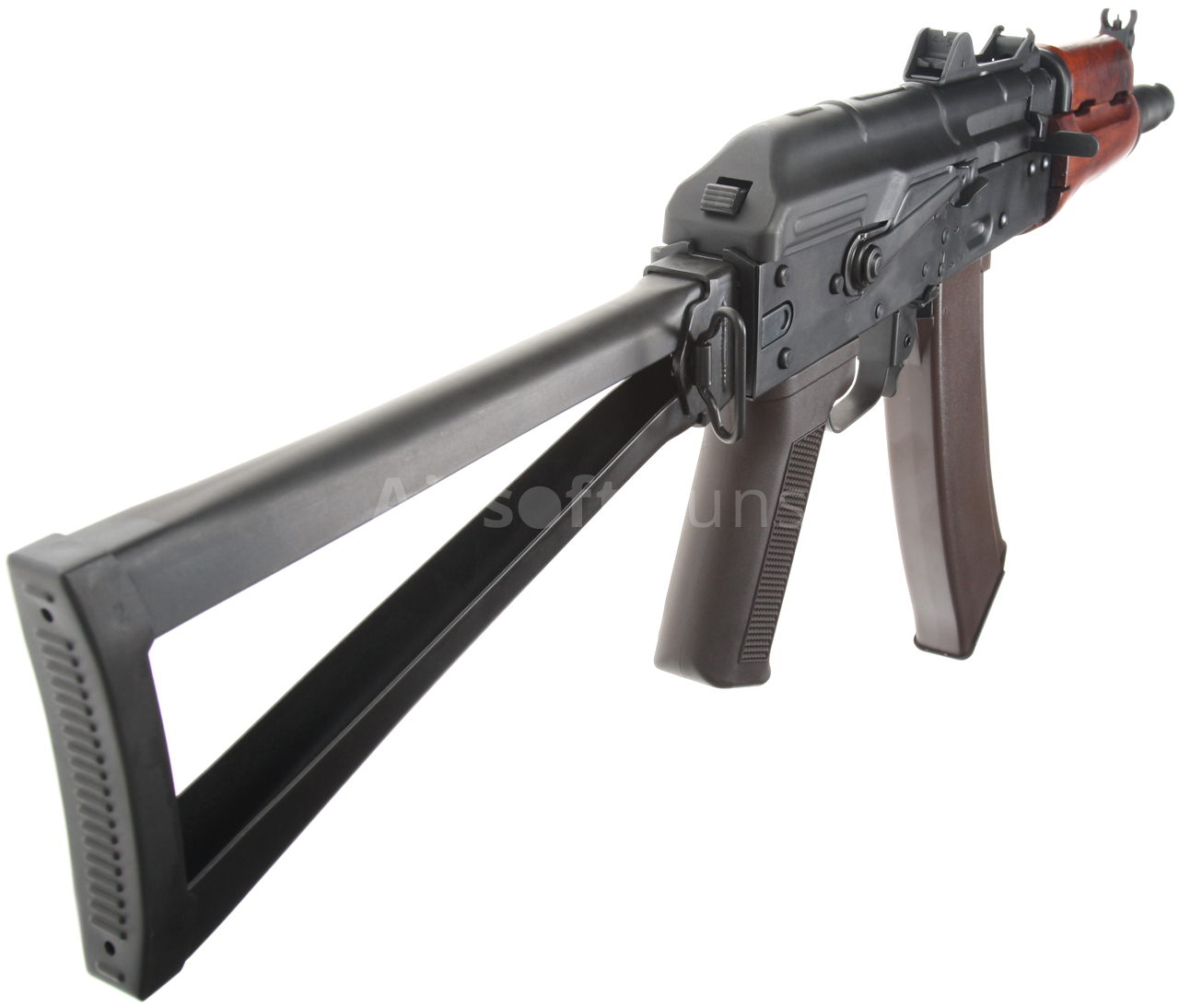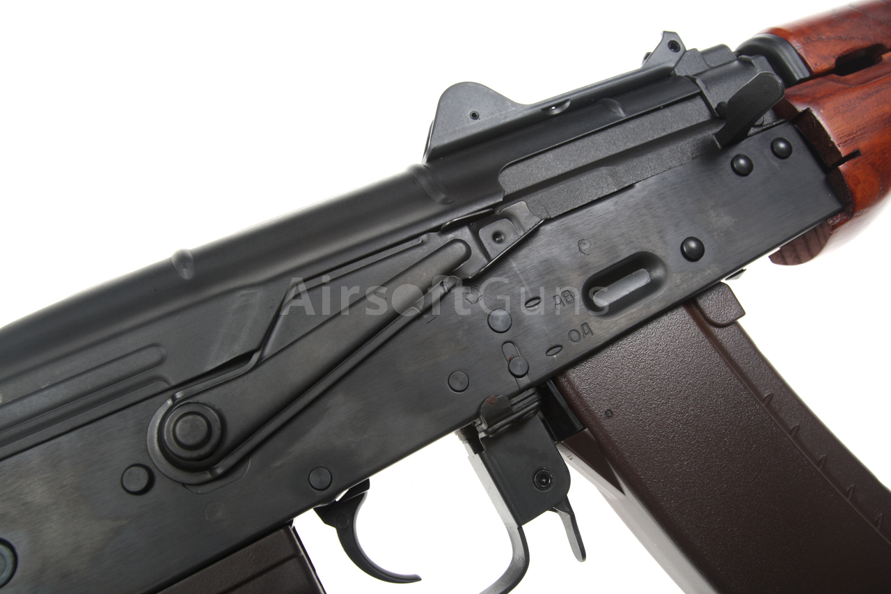 Airsoftová replika ruské legendární zbraně AKS-74U je vybavena bočně sklopnou pažbou, plně seřiditelnými mířidly, úchyty na popruh a robustním kompenzátorem, to vše je samozřejmě ocelové. Na levé straně těla je boční montážní lišta, pomocí které lze na zbraň snadno nasunout boční bázi AK s optikou nebo kolimátorem. Akumulátor se v případě této verze vkládá pod plechový kryt závěru, tedy do prostoru nad mechabox. Provedení je celo ocelové, takže z pevného polymeru naleznete pouze pažbičku a zásobník. Předpažbí je vyrobené z pravého dřeva.