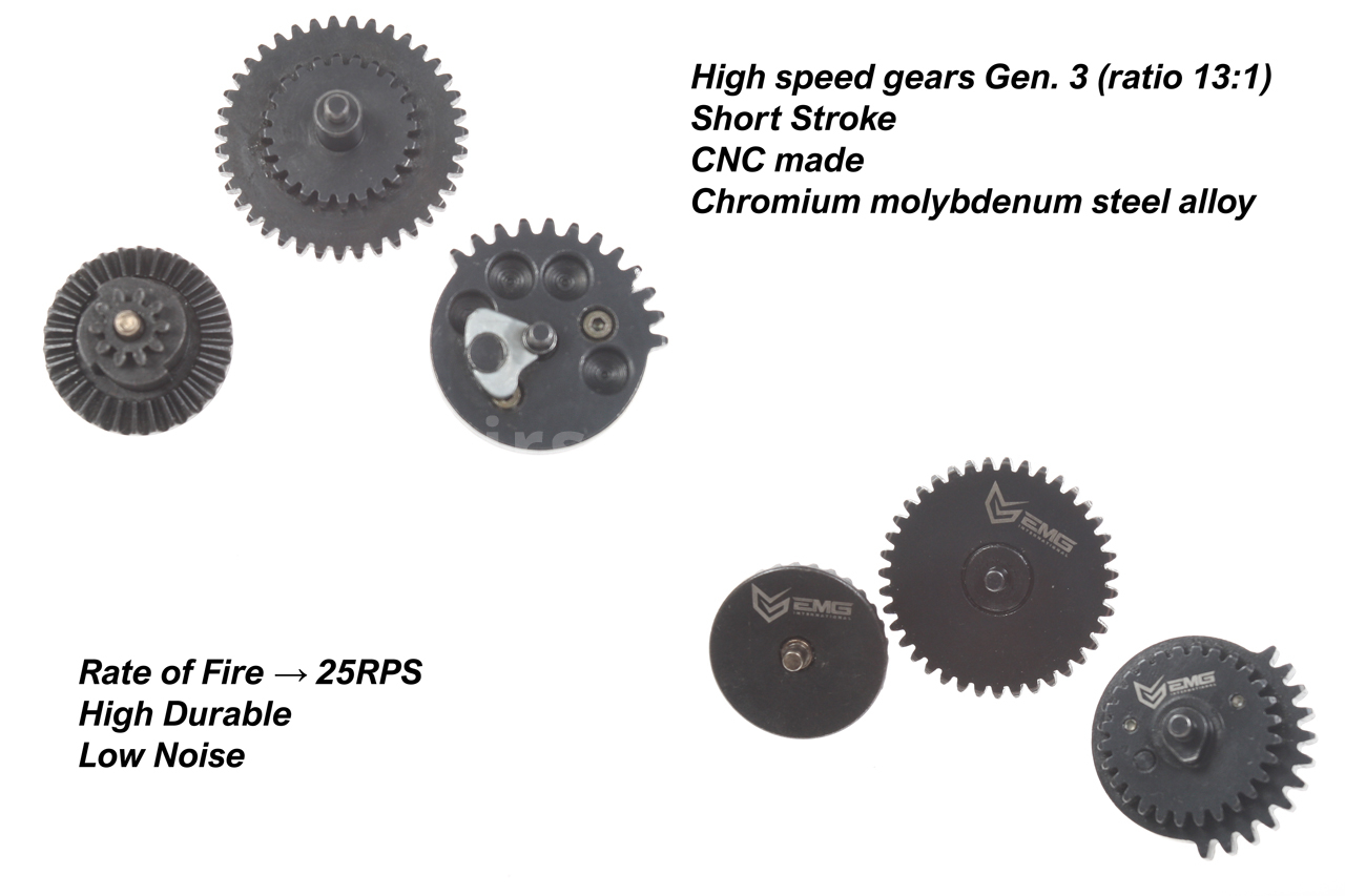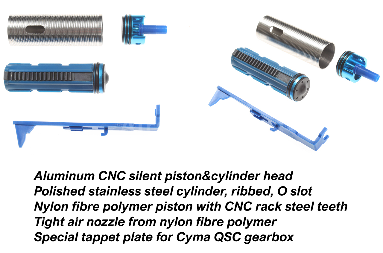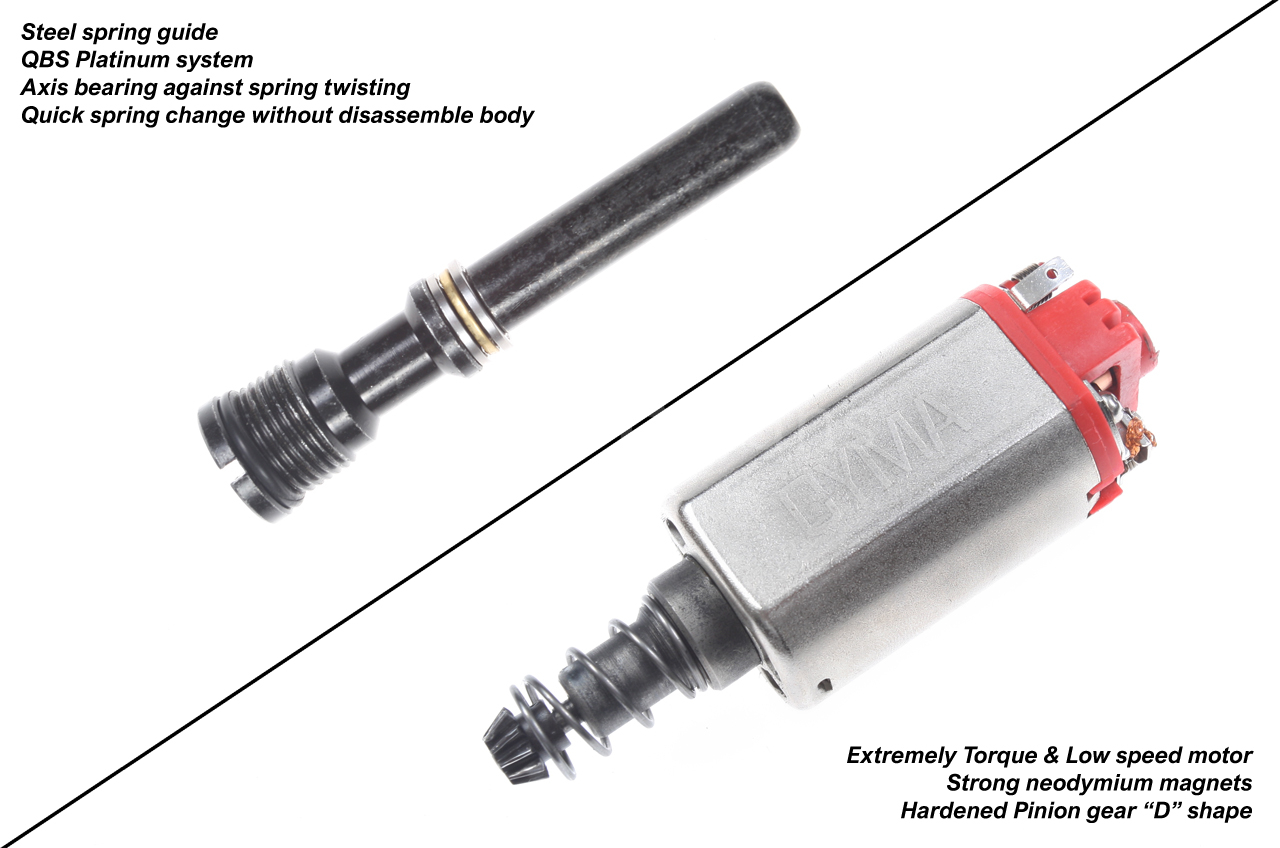 Kovový zesílený mechabox typu QSC obsahuje kvalitní ocelová kola (rychlý převod 13:1 vyráběný na CNC), polykarbonátový píst s kovovými zuby na hřebenu, precizní 8 mm kuličková ložiska, pružinu na úrovni M125, velice silný motor s neodymovými magnety, specifický kovový vodič pružiny s ložiskem, hliníkovou CNC hlavu válce (2 těsnící o-kroužky) a tichou hlavu pístu s ložiskem.
