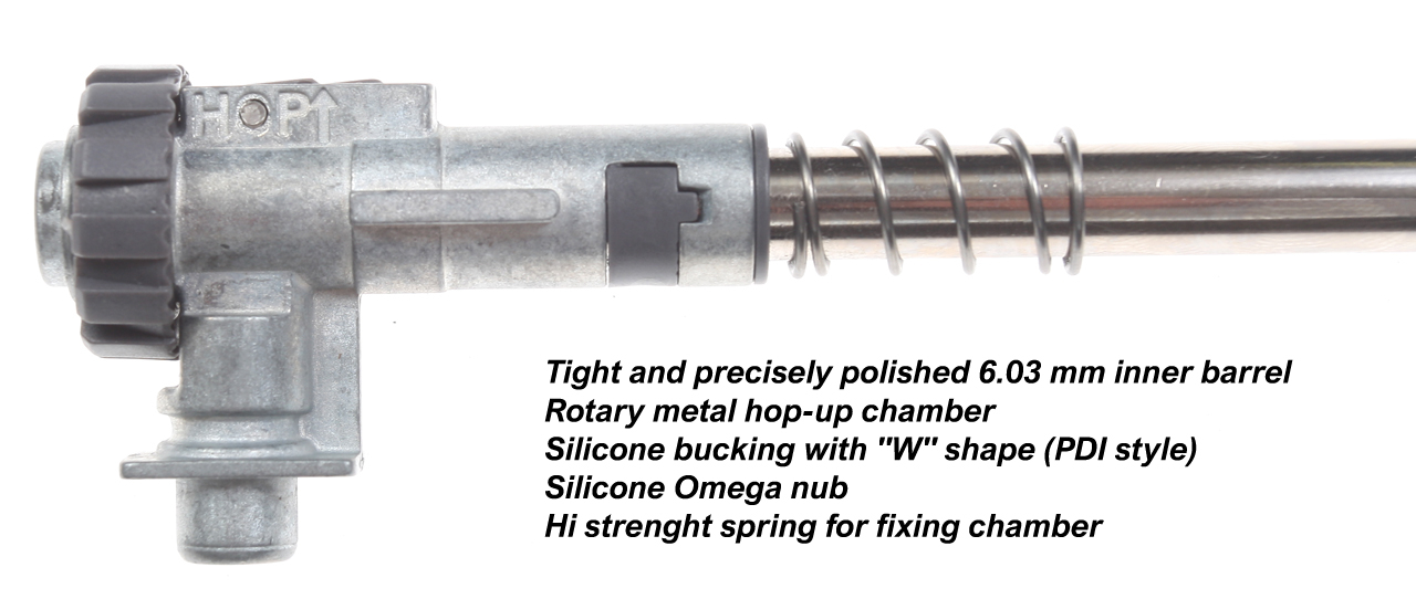 Upravený typ mechaboxu také obsahuje moderní řídicí jednotku (ETU) s integrovaným MOS FETem, pomocí které je zbraň spínána elektronicky. Toto řešení zajišťuje krátký chod spouště a velice rychlou odezvu celé sestavy po sepnutí mikrospínače. V základu jistě potěší i jednodílná kovová Hop-Up komora stylu ProWin a přesná hlaveň bez dodatečných povrchových úprav o vnitřním průměru 6,03 mm. Součástí balení je plastový vytěrák na čištění hlavně a dvouřadý tlačný zásobník PMAG s kapacitou 160 BB (Midcap).