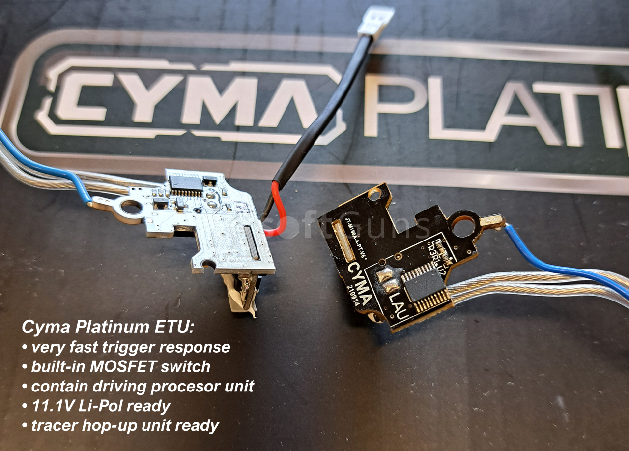 Cyma Platinum Edition doznala od roku 2025 výrazná vylepšení, oproti předcházejícím sériím. Těla i vnější díly jsou nyní vyráběné z těch nejlepších materiálů. Mnoho dílů je obráběných na přesných CNC strojích. Obyčejné ABS plasty byly nahrazeny za nylonový polymer s příměsí skelného vlákna, pro zvýšení odolnosti. U vnitřních dílů najdeme to nejlepší, co současný svět airsoftu nabízí např. nové Hop-Up gumičky, modifikované kovové komory, přesné hlavně 6,03 mm, nové zesílené QSC mechaboxy, zátěžové vnitřní CNC díly, špičkovou vzduchotechniku zbraně a velmi často i elektronické spínání (ETU).