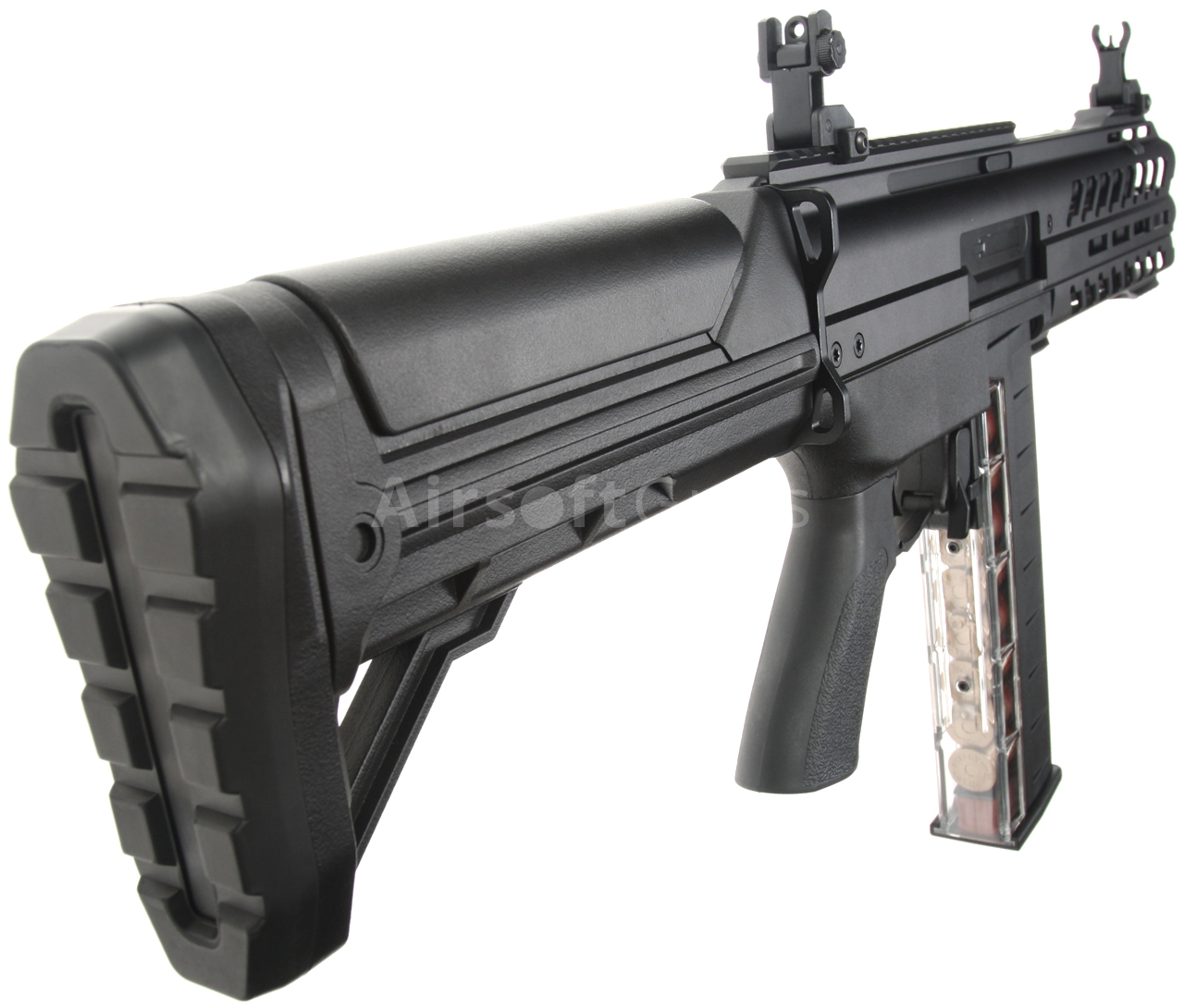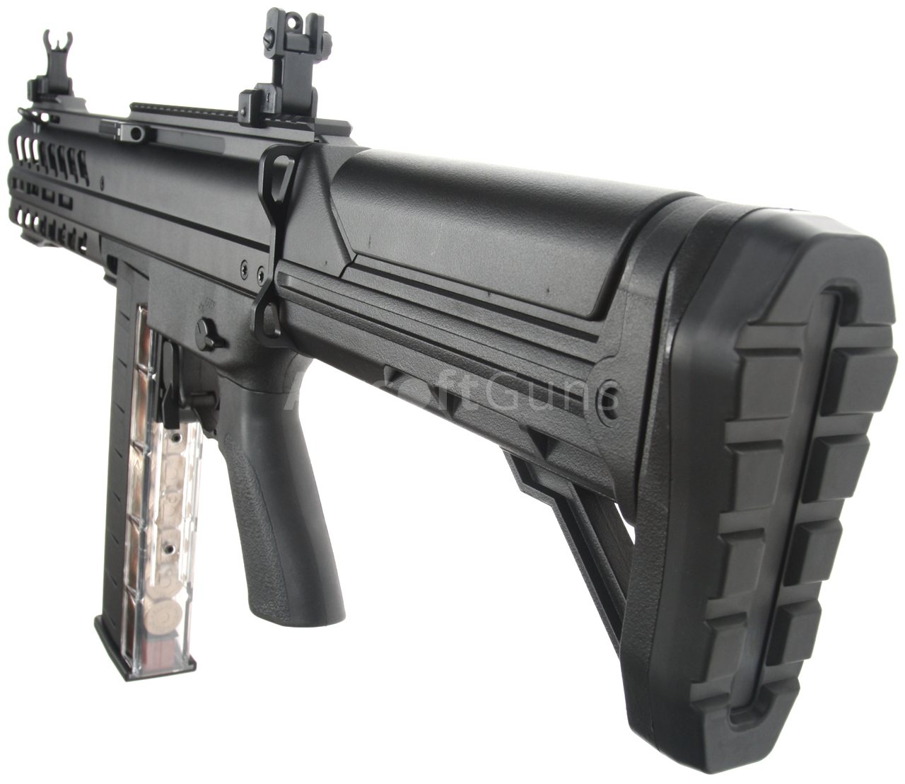 Pevná pažba s lícnicí je rovněž z polymeru a pod její gumovou patkou se nachází prostor pro akumulátor. Součástí balení je tlačný polymerový zásobník s kapacitou 93 BB, který má průhlednou zadní stěnu s imitací brokových patron pro realističtější vzhled.