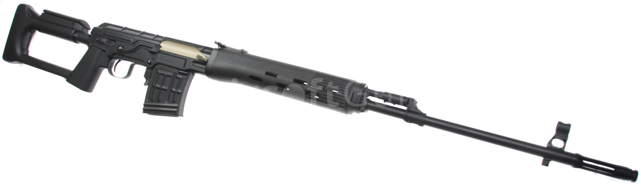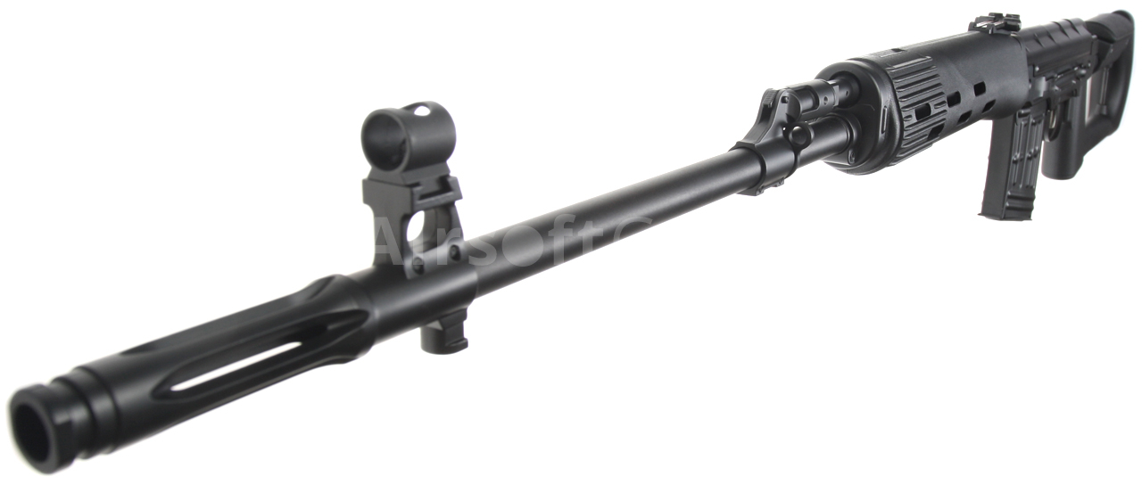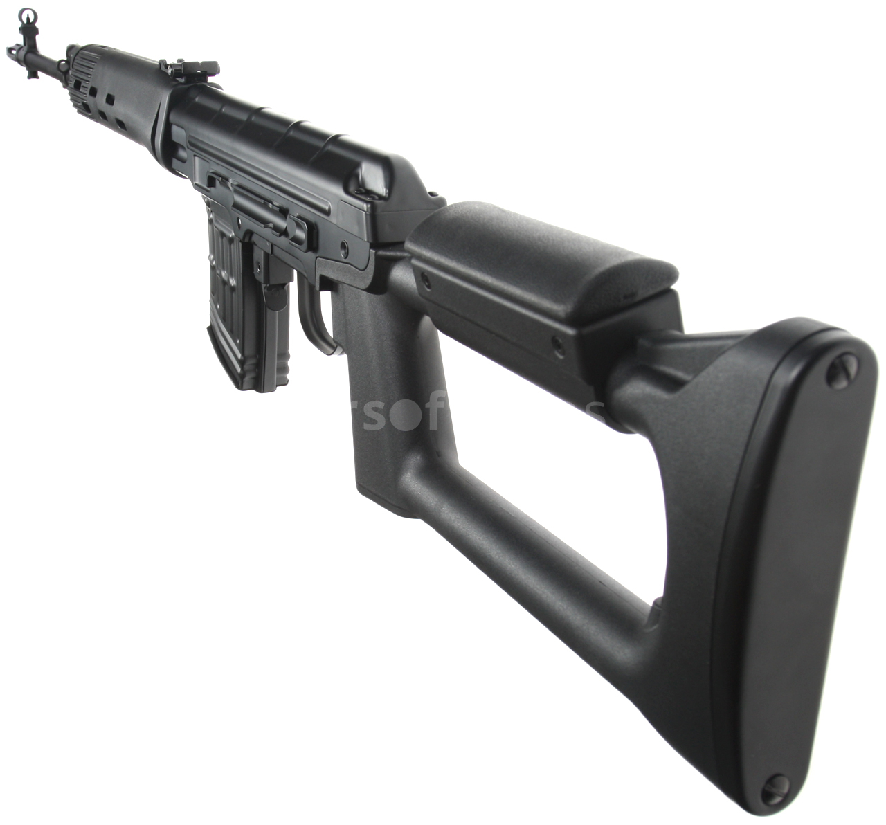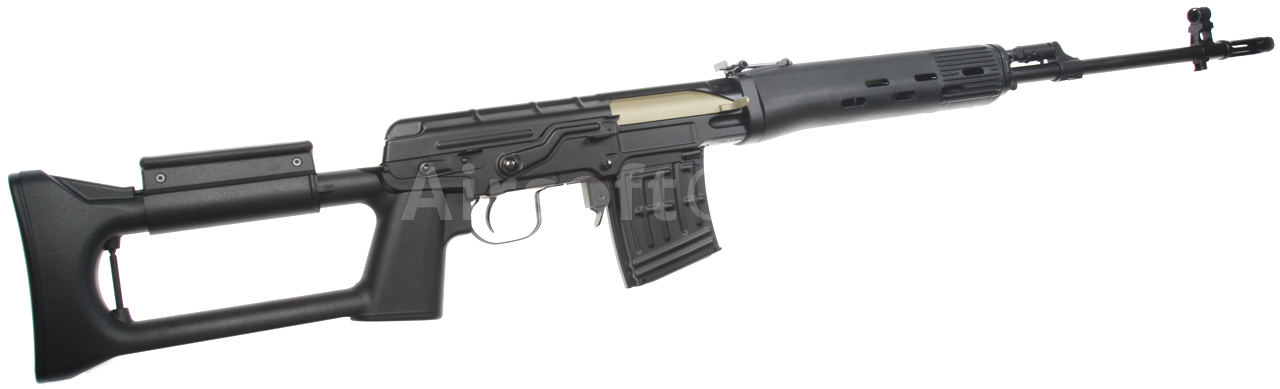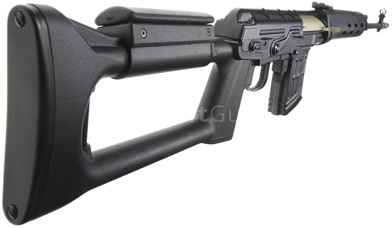 Dragunov SVD, Black, Cyma Standard, CM.057T. Elektrická airsoftová zbraň. Replika modernizovaného modelu Dragunov SVD [CM.057T] Cyma Standard Edition v celokovovém provedení v černé barvě. Pokud jste fanouškem pušky Dragunov a chcete nejnovější a nejlepší verzi ikonické ruské pušky DMR, pak je toto replika přesně pro vás. Tato modernizovaná varianta SVD pušky se stále vyrábí v ruském koncernu Kalashnikov. Celokovová airsoftová replika je opatřena plastovým předpažbím a fixní pažbou s nastavitelnou lícnicí. Lučík, záchyt zásobníku, kryt závěru a další drobné dílky jsou z oceli. Na levé straně těla je lišta pro nasazení puškohledu PSO nebo standardní montážní báze SVD s RIS lištou. Baterie se vkládá do předpažbí.