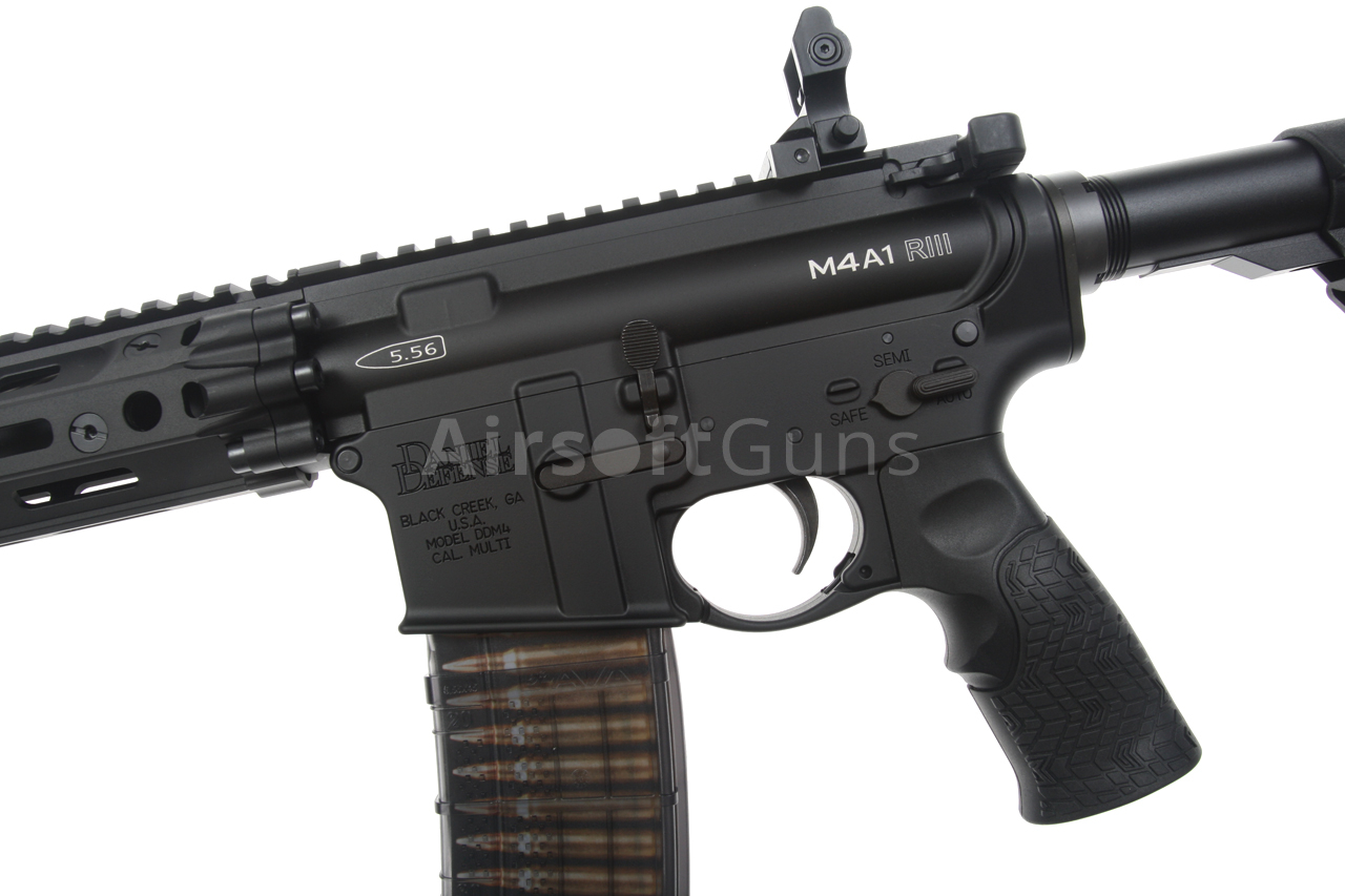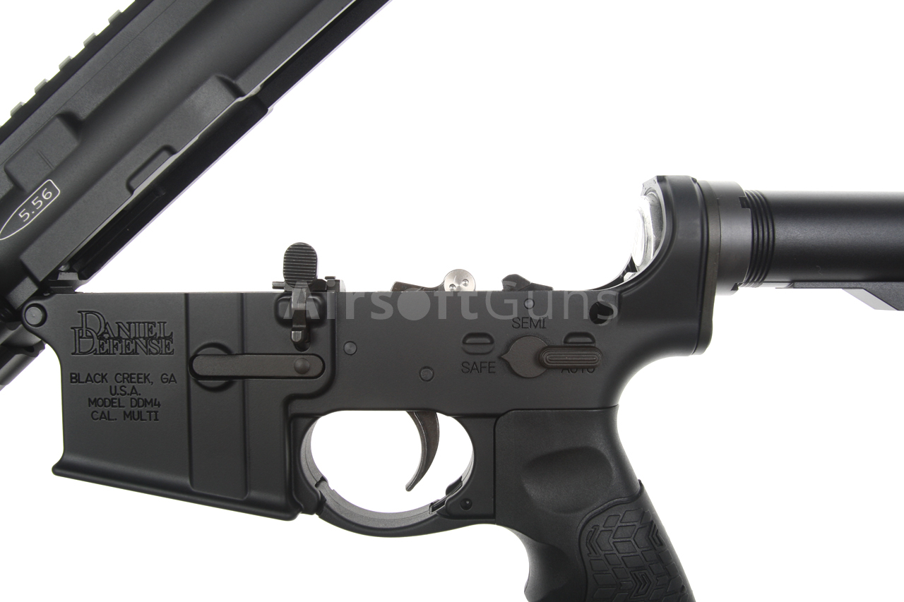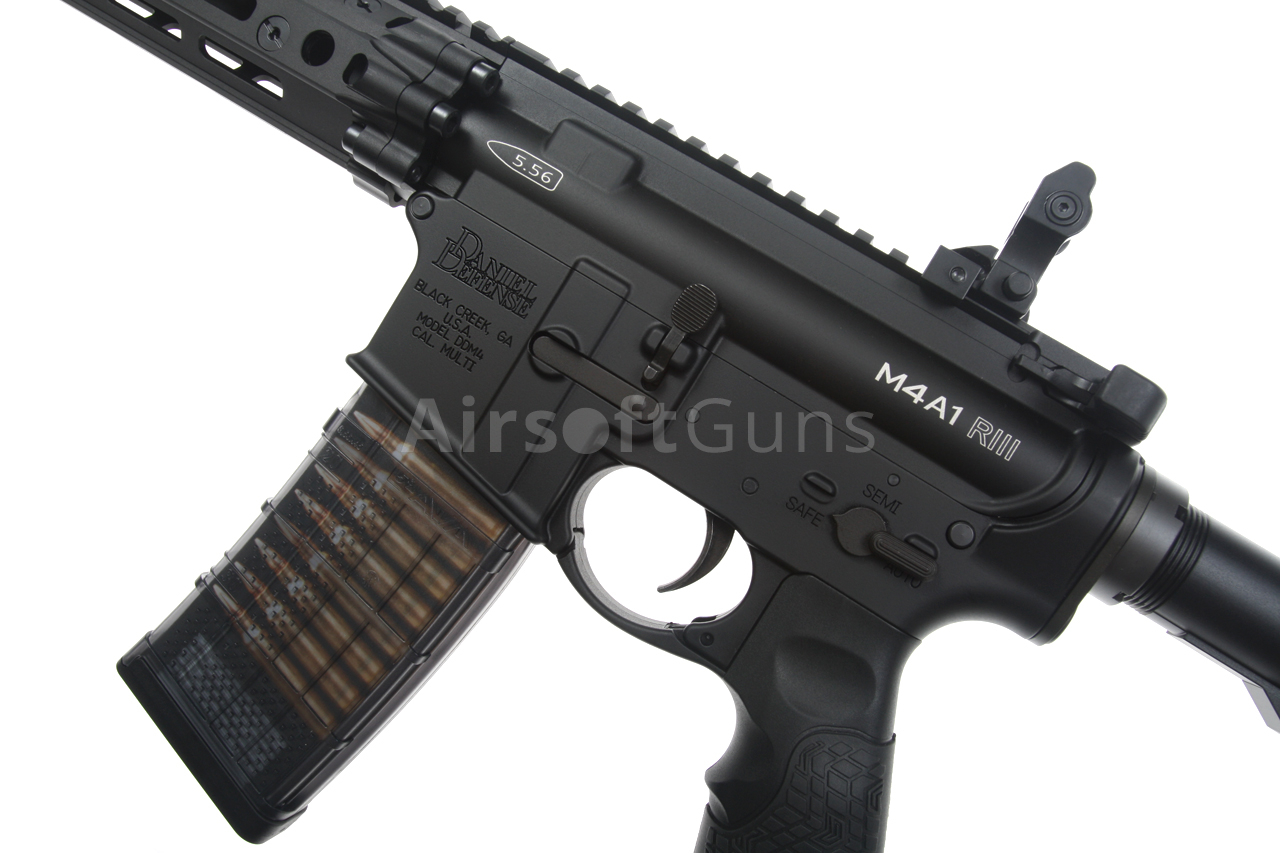 Tato verze klasické karabiny AR15 nabízí nádherně zpracované tělo v černé barvě s originální ražbou Daniel Defense (licencováno EMG) a unikátním sériovým číslem. Zbraň je osazena moderním CNC kovovým předpažbím RIII M-Lok (12,5 palců), které je mnohem lehčí a užší než běžné RISko a proto zaručuje skvělý úchop. Moderní M-Lok systém umožňuje montáž taktického příslušenství dle preferencí každého uživatele.