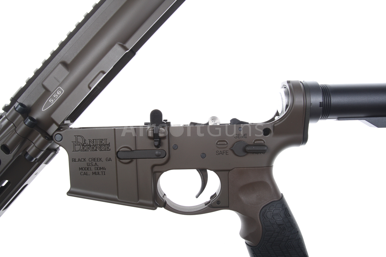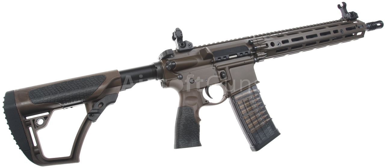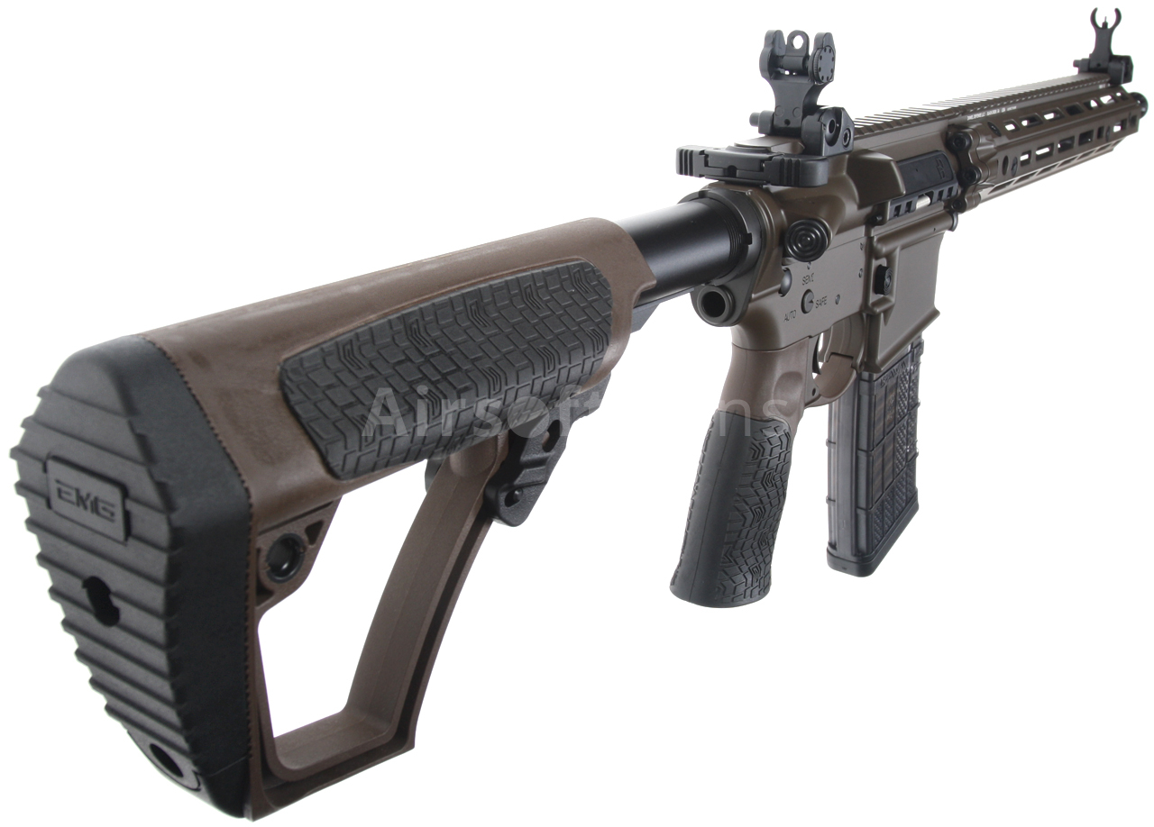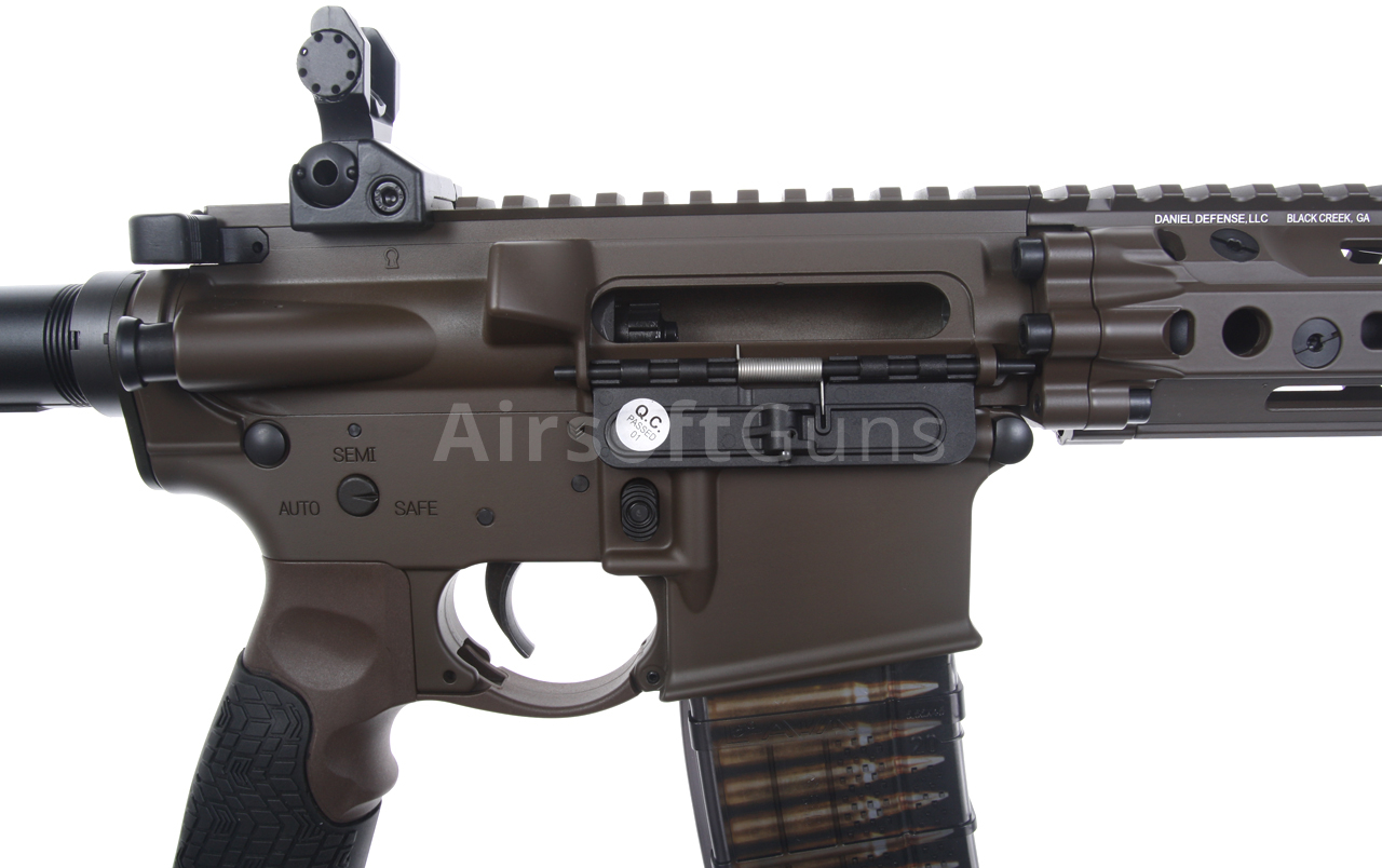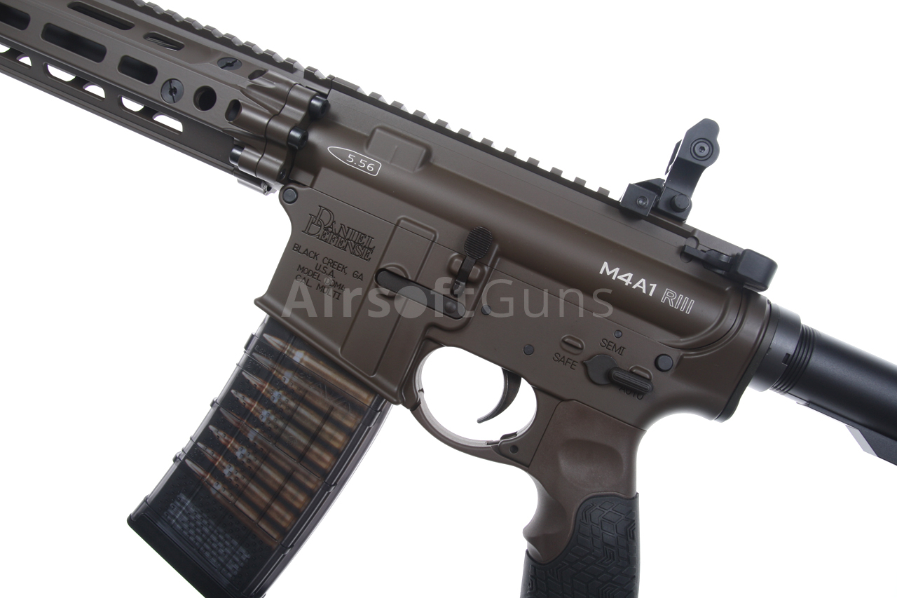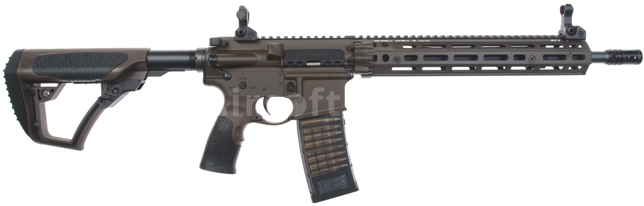 Tato verze klasické karabiny AR15 nabízí nádherně zpracované tělo v tmavě hnědé barvě s originální ražbou Daniel Defense (licencováno EMG) a unikátním sériovým číslem. Zbraň je osazena moderním CNC kovovým předpažbím RIII M-Lok (12,5 palců), které je mnohem lehčí a užší než běžné RISko a proto zaručuje skvělý úchop. Moderní M-Lok systém umožňuje montáž taktického příslušenství dle preferencí každého uživatele.