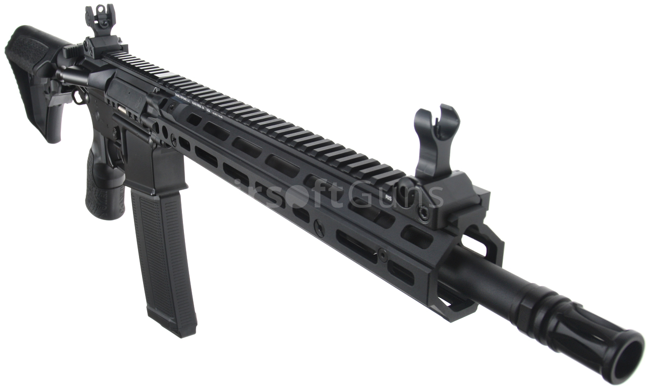 Zbraň je vybavena teleskopicky zásuvnou pažbou Daniel Defense, která nabízí 6 poloh délkového nastavení a umožňuje vložení doporučeného typu LiPol baterie. Kovová vnější hlaveň o délce 14,5 palce je osazena klasickým kompenzátorem M4A1, který je našroubovaný na 14 mm levotočivém závitu.