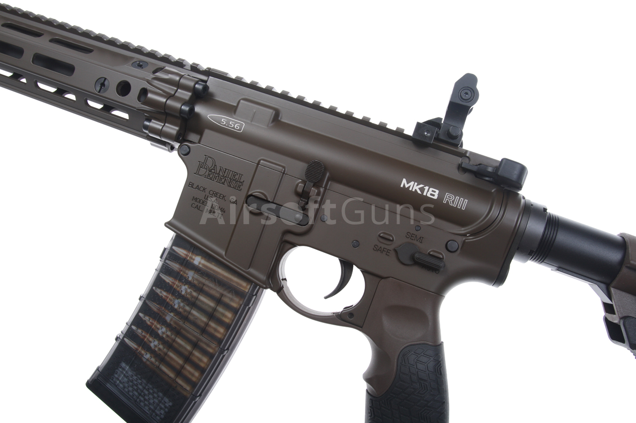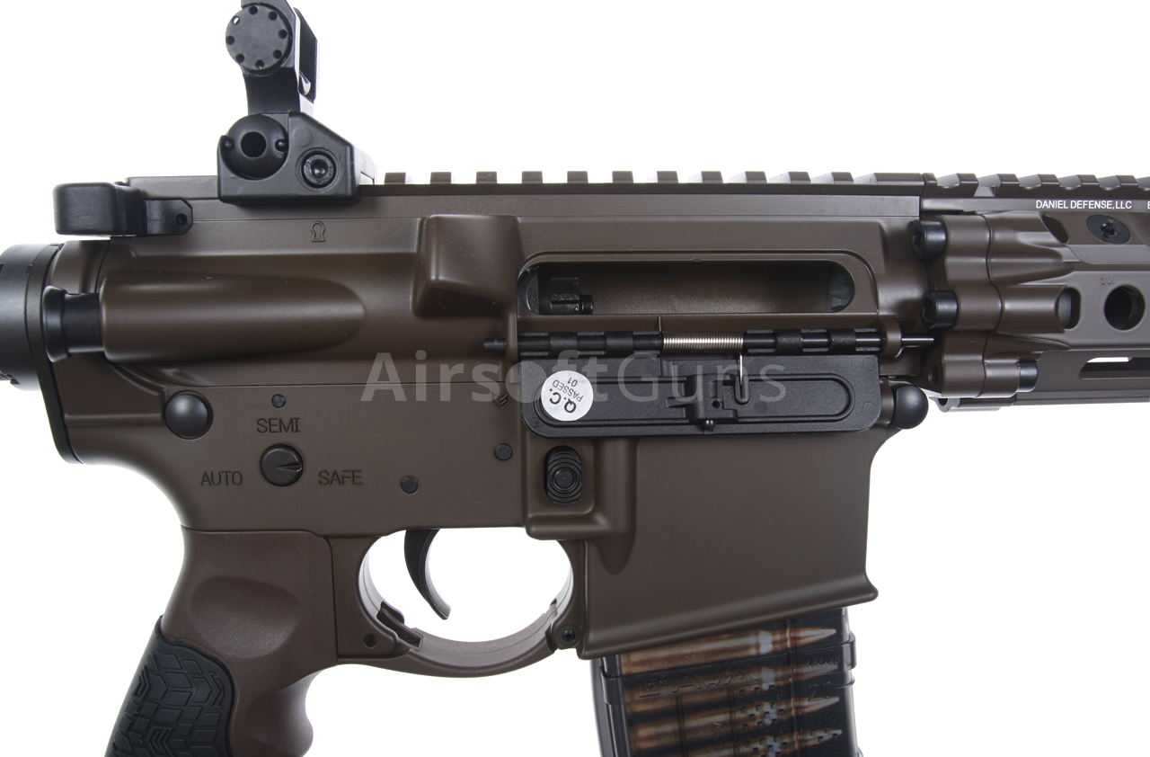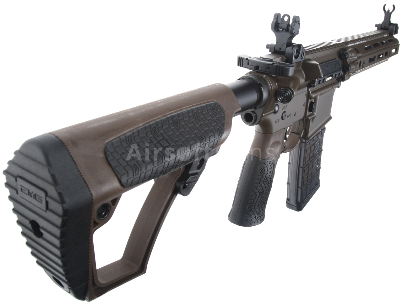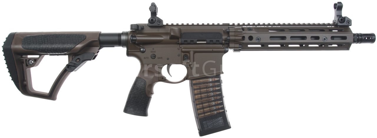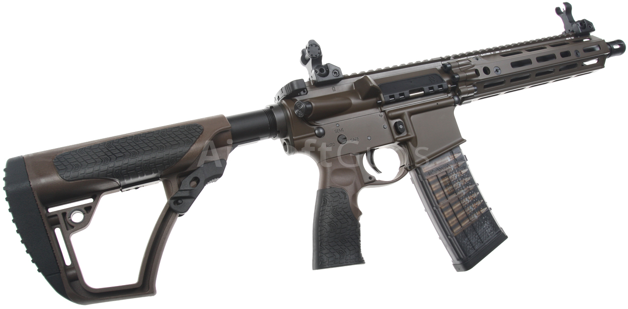 Tato verze zkrácené karabiny AR15 nabízí nádherně zpracované tělo v hnědé barvě s originální ražbou Daniel Defense (licencováno EMG) a unikátním sériovým číslem. Zbraň je osazena moderním CNC kovovým předpažbím RIII M-Lok (9,5 palců), které je mnohem lehčí a užší než běžné RISko a proto zaručuje skvělý úchop. Moderní M-Lok systém umožňuje montáž taktického příslušenství dle preferencí každého uživatele.