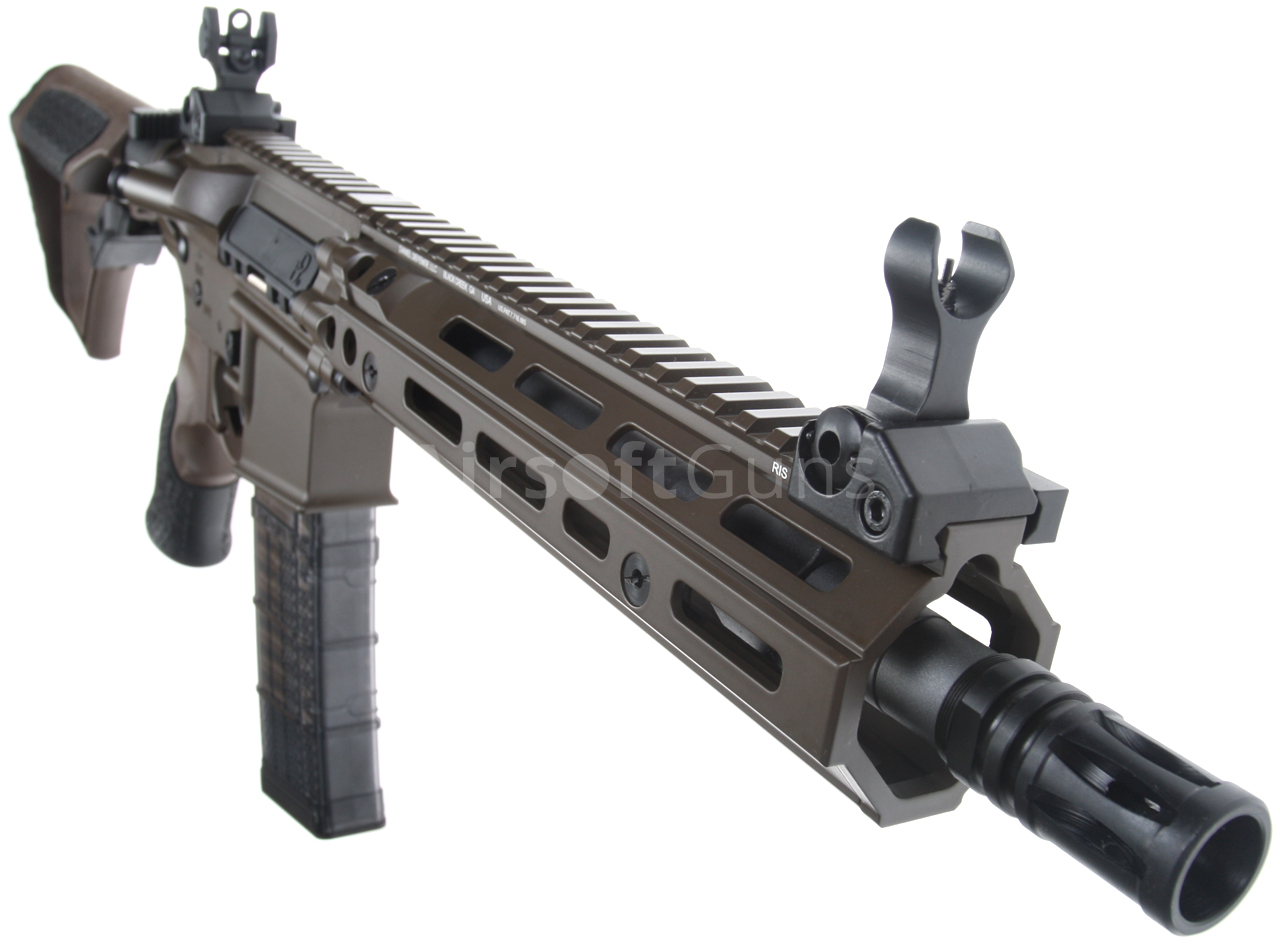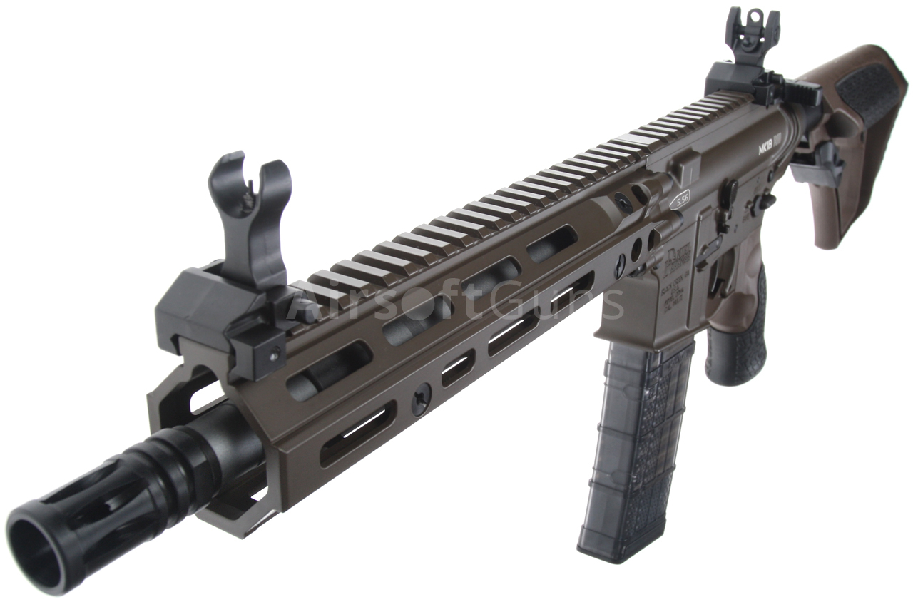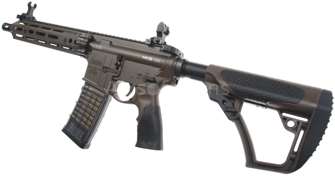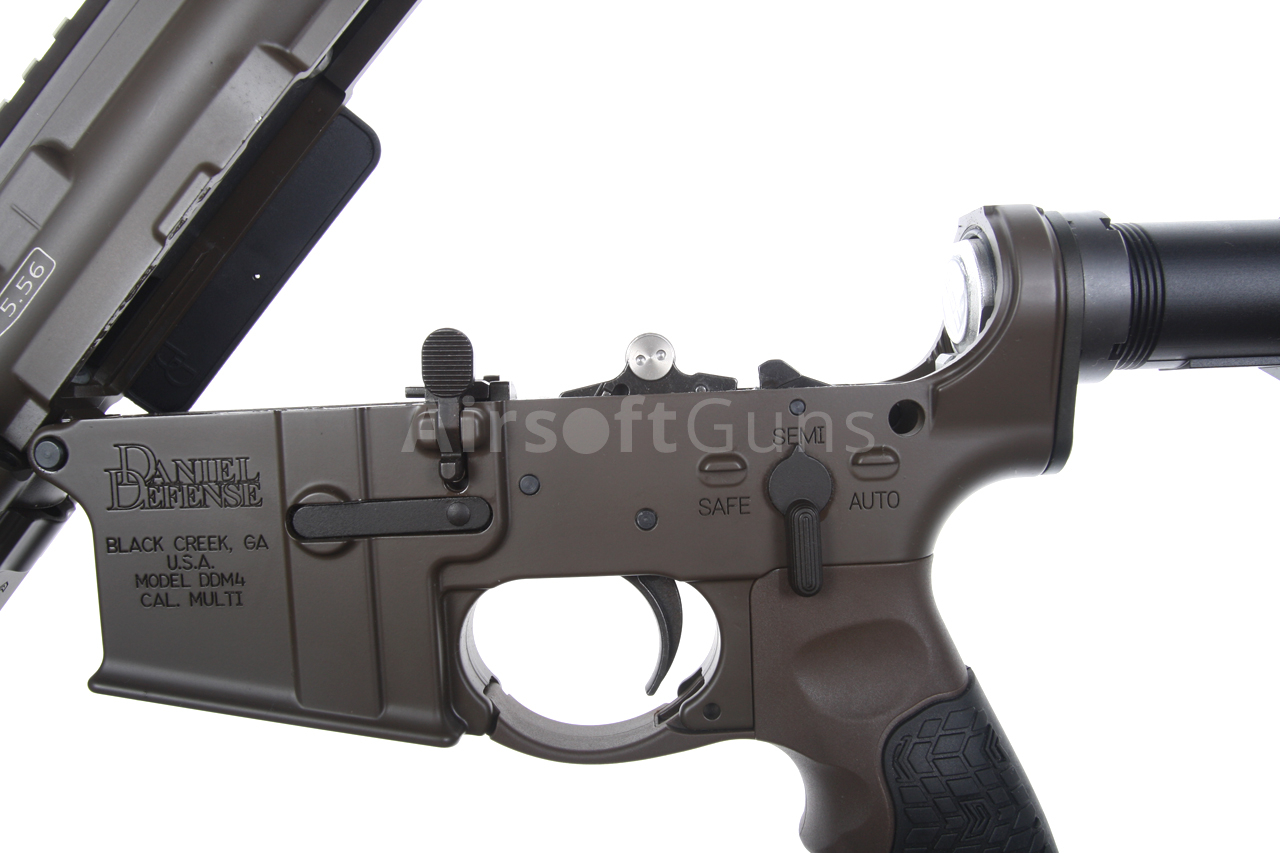 Tato verze zkrácené karabiny AR15 nabízí nádherně zpracované tělo v hnědé barvě s originální ražbou Daniel Defense (licencováno EMG) a unikátním sériovým číslem. Zbraň je osazena moderním CNC kovovým předpažbím RIII M-Lok (9,5 palců), které je mnohem lehčí a užší než běžné RISko a proto zaručuje skvělý úchop. Moderní M-Lok systém umožňuje montáž taktického příslušenství dle preferencí každého uživatele.
