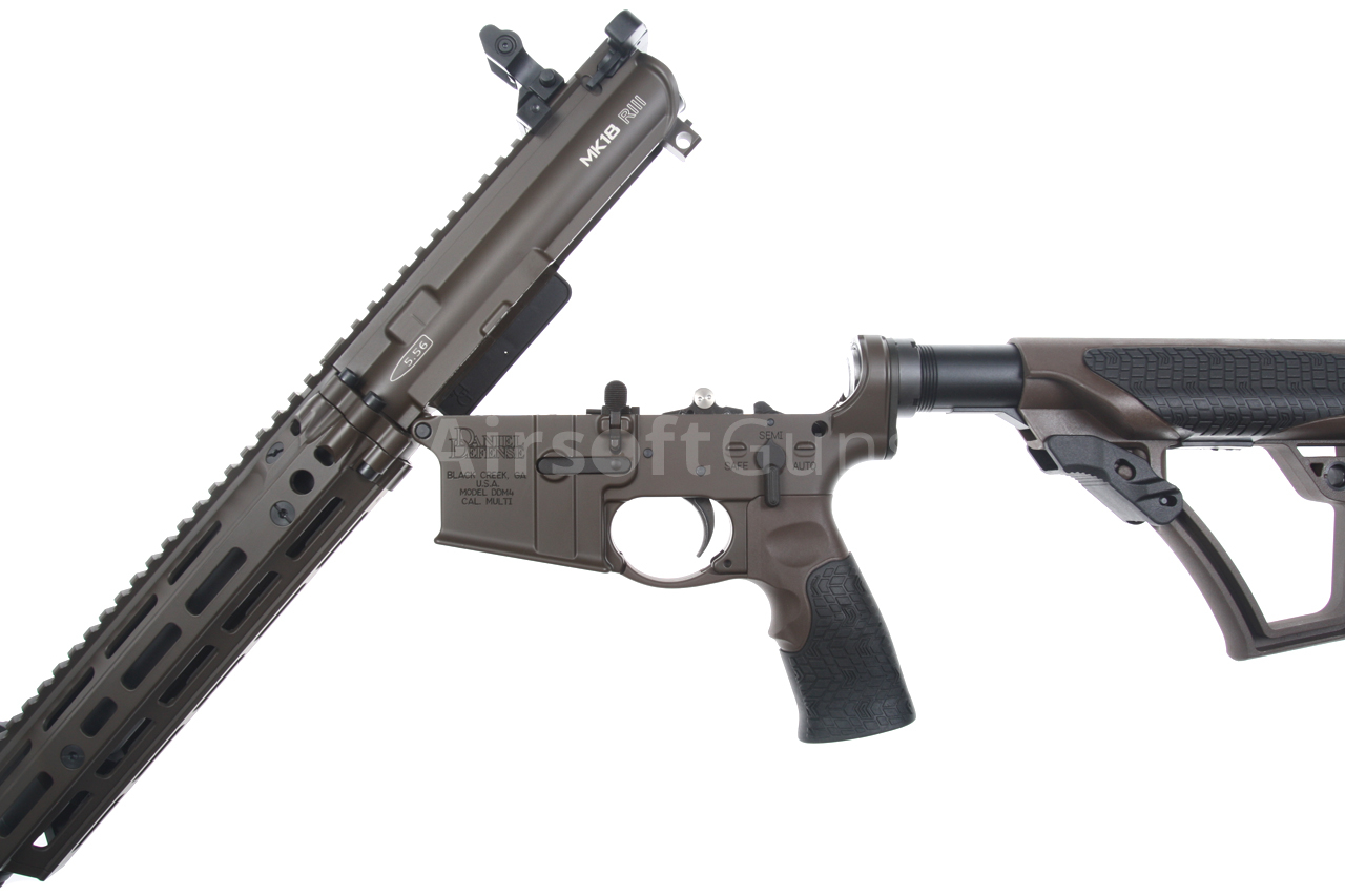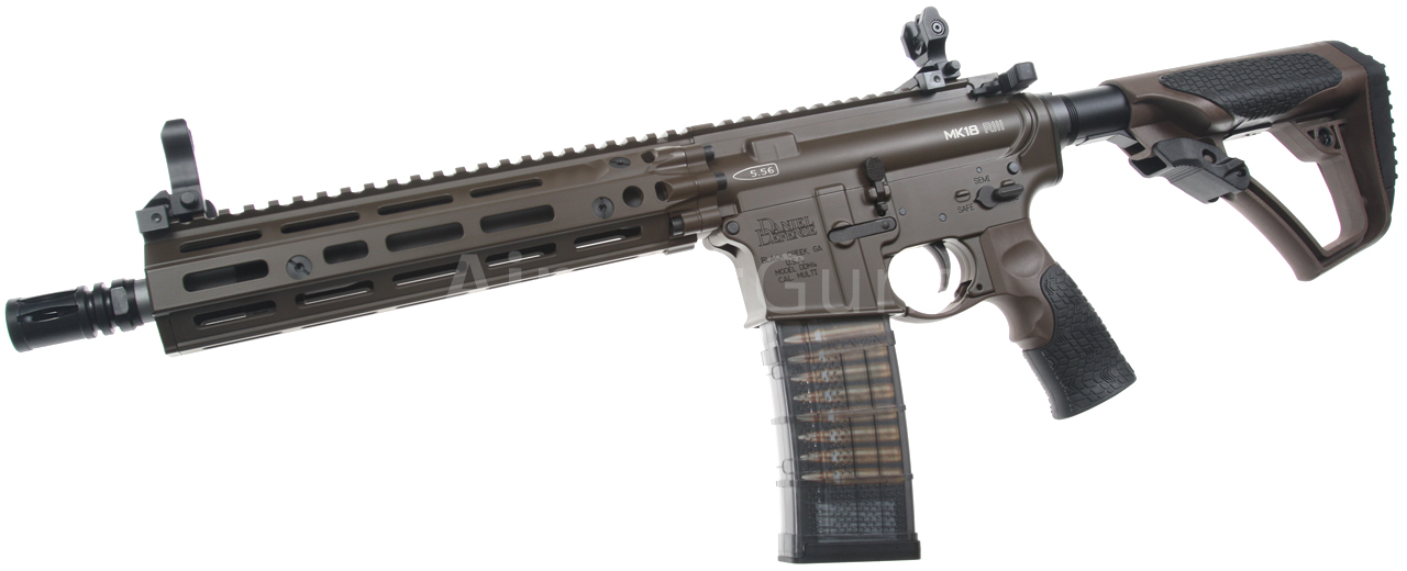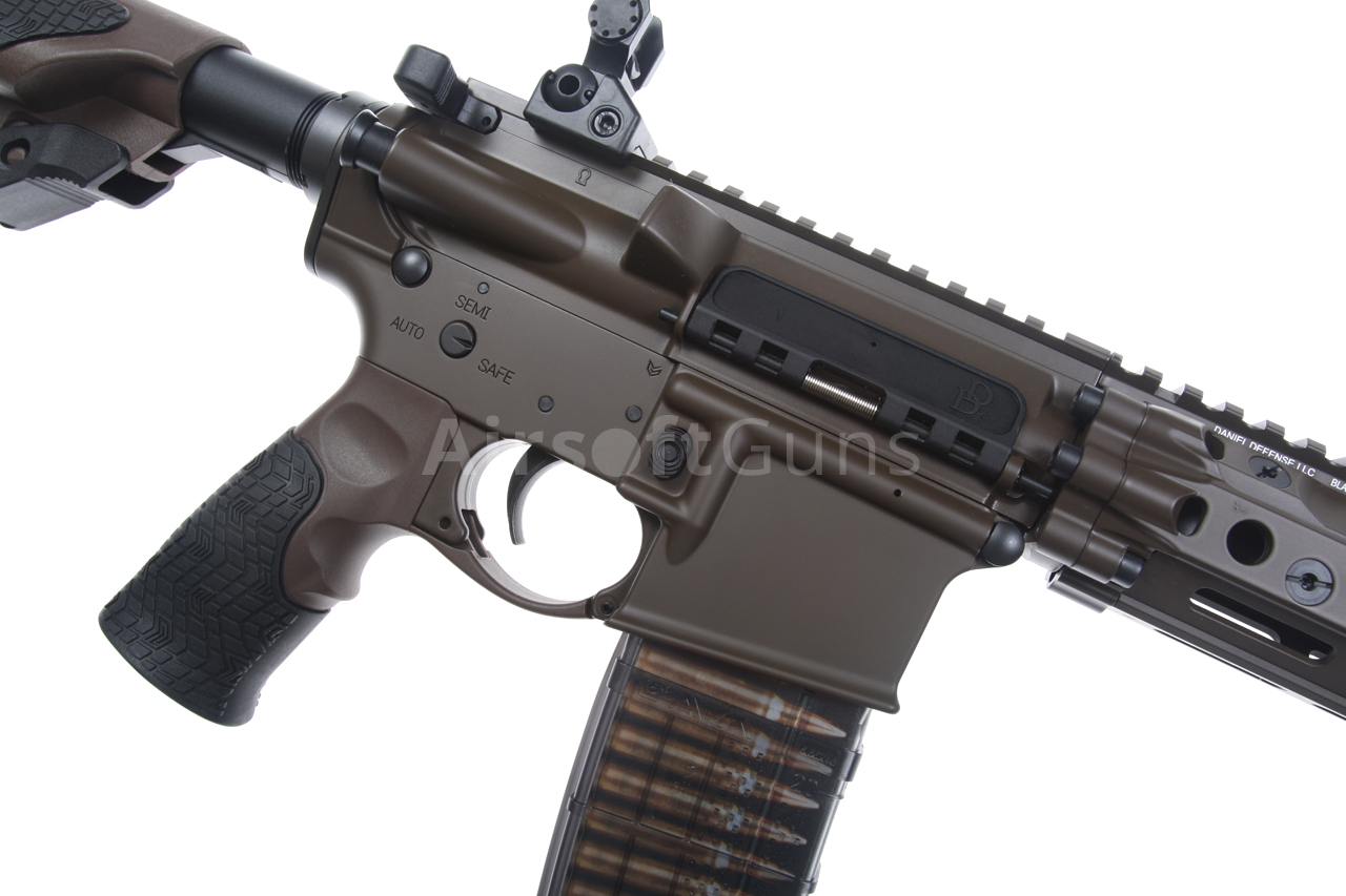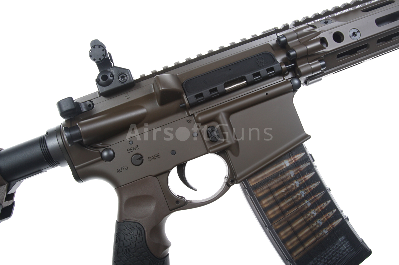 Tato verze zkrácené karabiny AR15 nabízí nádherně zpracované tělo v hnědé barvě s originální ražbou Daniel Defense (licencováno EMG) a unikátním sériovým číslem. Zbraň je osazena moderním CNC kovovým předpažbím RIII M-Lok (9,5 palců), které je mnohem lehčí a užší než běžné RISko a proto zaručuje skvělý úchop. Moderní M-Lok systém umožňuje montáž taktického příslušenství dle preferencí každého uživatele.