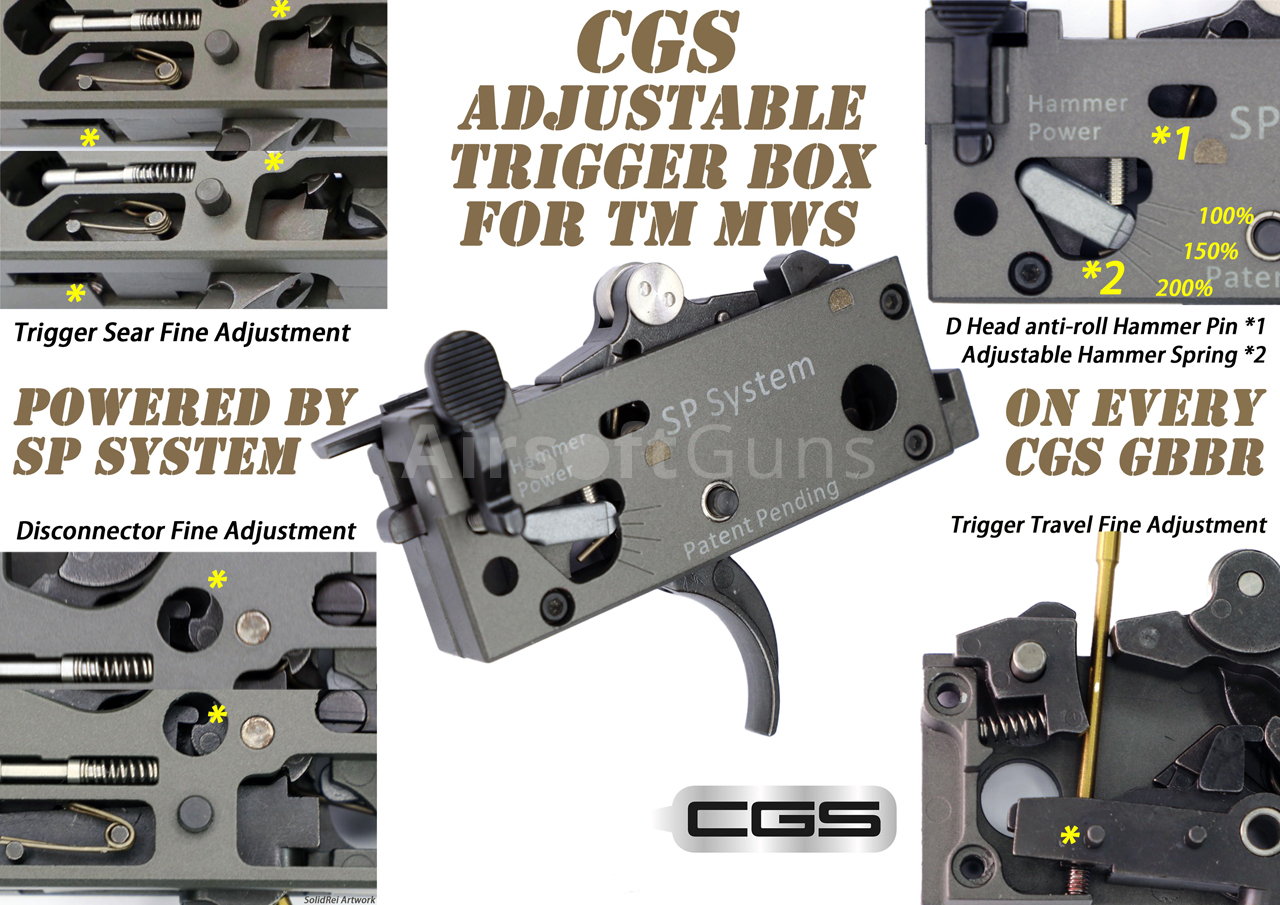 Řada airsoft GBBR replik CGS (Cyma GAS System) představuje průlomový design s nejnovějšími pokroky v oblasti plynových BlowBack pušek. Je kompatibilní s většinou standardních dílů TM MWS a slouží jako vynikající základní zbraň, kterou lze bez námahy upgradovat a upravovat. Systém CGS nabízí ve srovnání s alternativními systémy vynikající spolehlivost a účinnost a poskytuje tak zcela spolehlivou platformu.