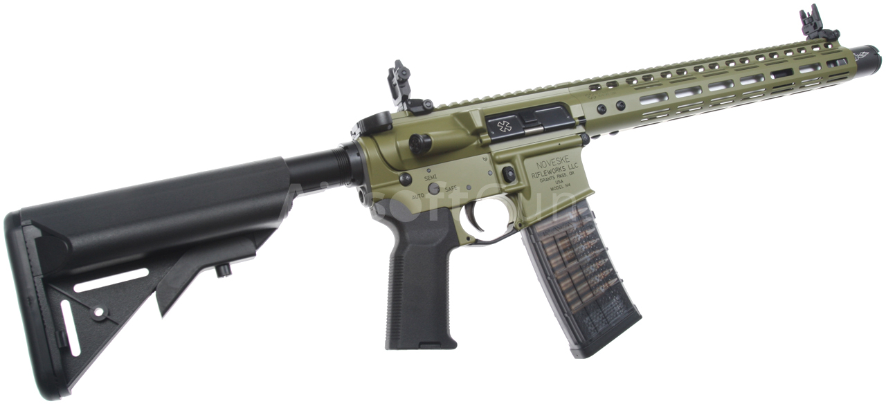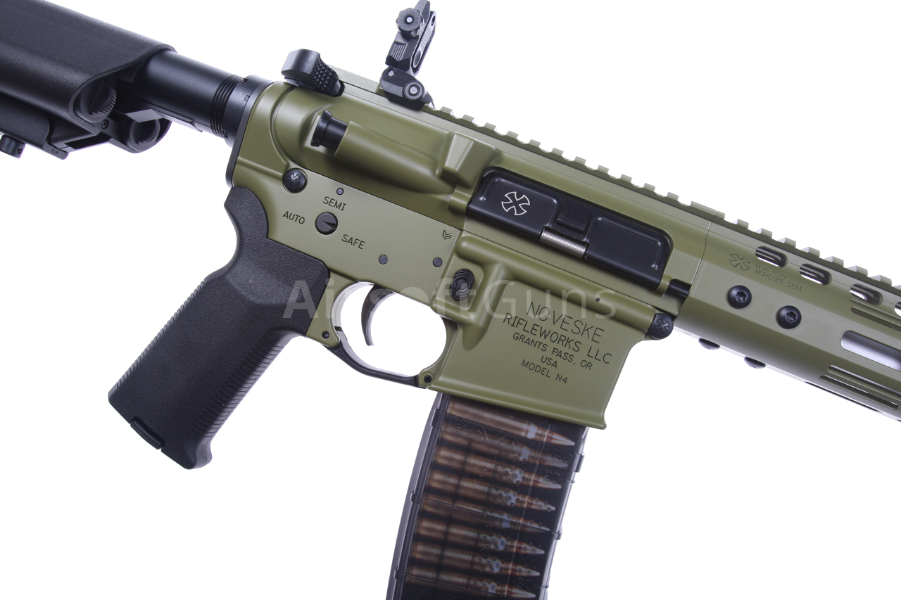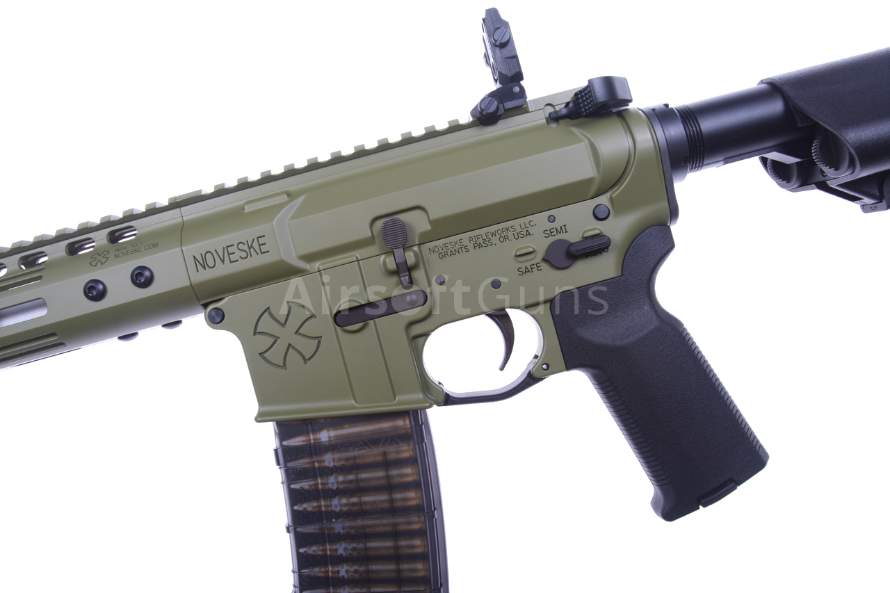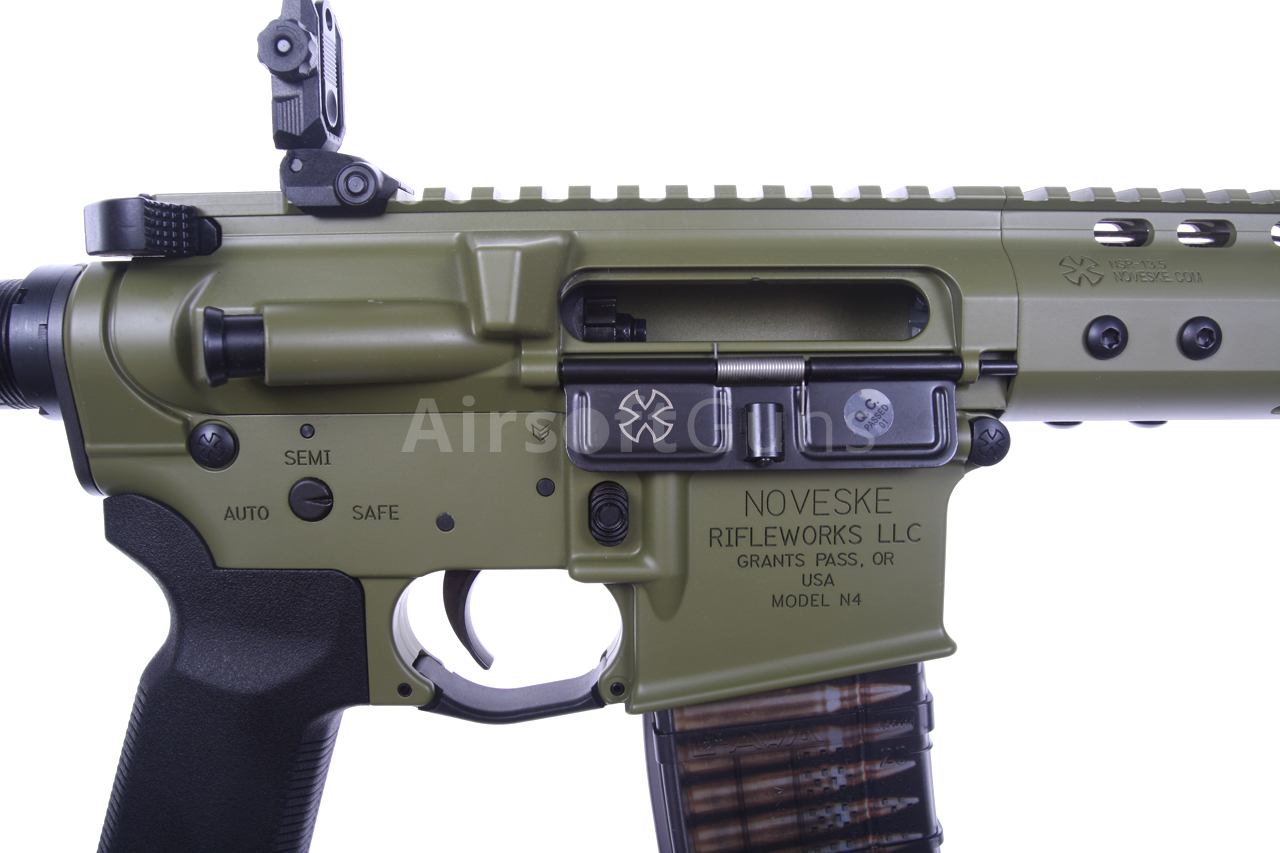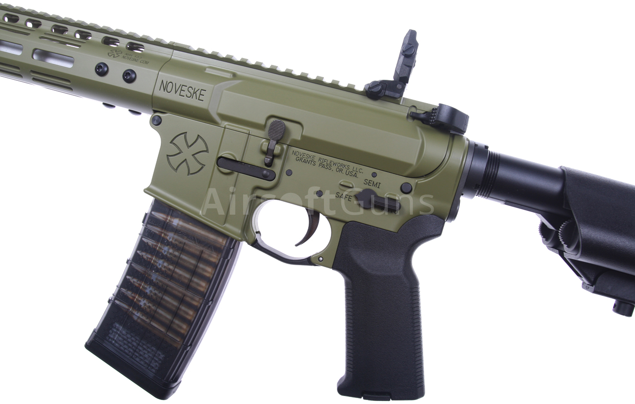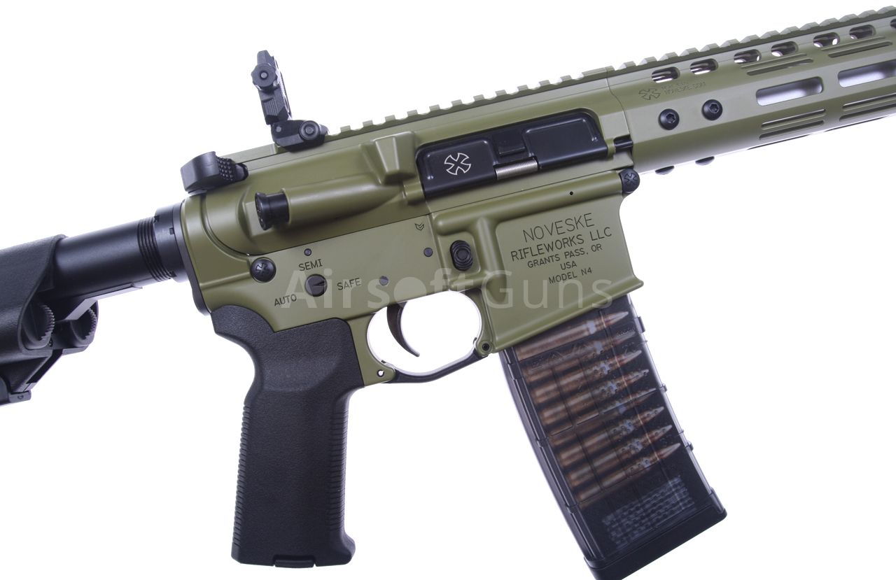 Tato verze klasické karabiny AR15 nabízí nádherně zpracované tělo v barvě Bazooka Green s originální ražbou Noveske (licencováno EMG) a unikátním sériovým číslem. Zbraň je osazena moderním CNC kovovým předpažbím Noveske NSR-13.5 M-Lok (délka 13,5 palců), které je mnohem lehčí a užší než běžné RISko a proto zaručuje skvělý úchop. Moderní M-Lok systém umožňuje montáž taktického příslušenství dle preferencí každého uživatele.