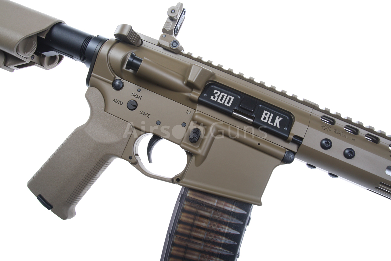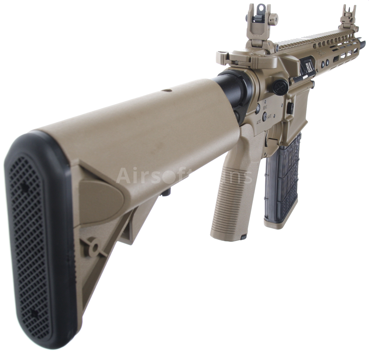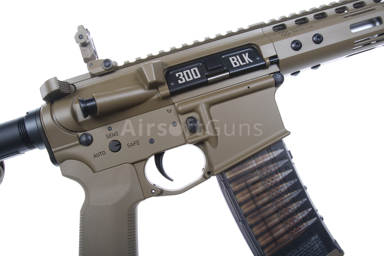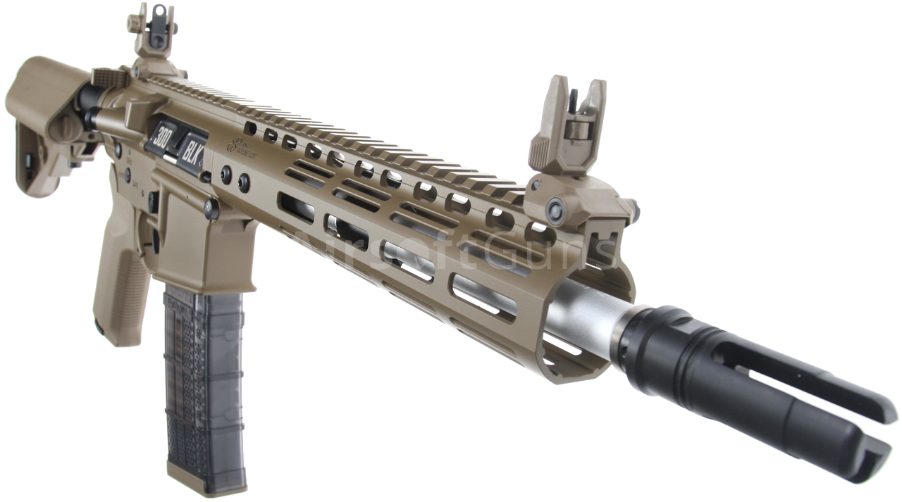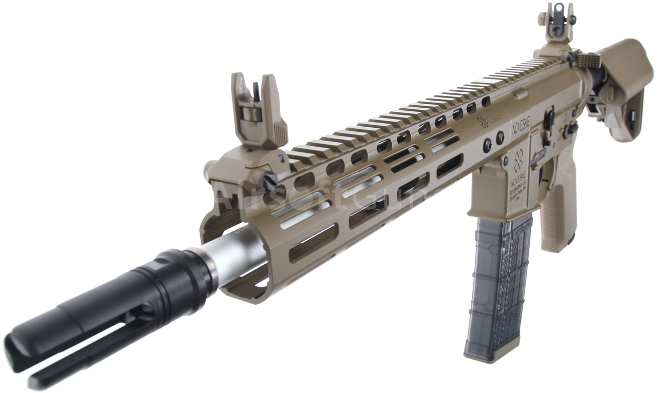 Tato verze zkrácené karabiny AR15 nabízí nádherně zpracované tělo v barvě FDE s originální ražbou Noveske (licencováno EMG) a unikátním sériovým číslem. Zbraň je osazena moderním CNC kovovým předpažbím Noveske NSR-9 M-Lok (délka 9 palců), které je mnohem lehčí a užší než běžné RISko a proto zaručuje skvělý úchop. Moderní M-Lok systém umožňuje montáž taktického příslušenství dle preferencí každého uživatele.