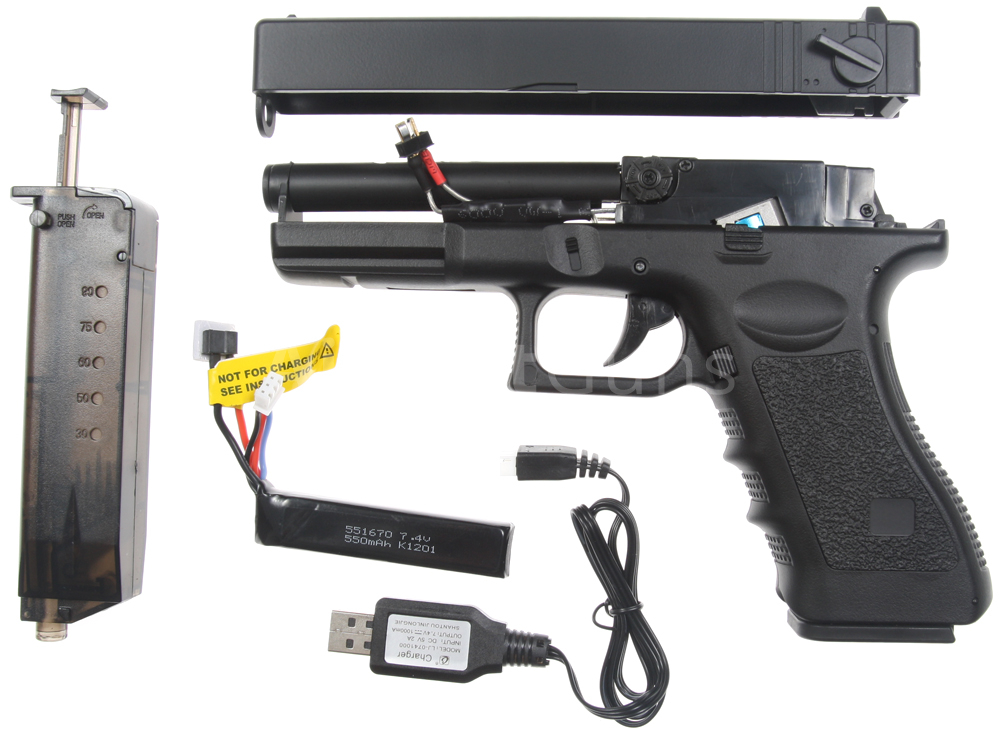 Součástí balení je USB LiPol 7,4V nabíječka, akumulátor LiPol 7,4V/500 mAh, rychloplnička, vytěrák a zásobník na 30 BB.