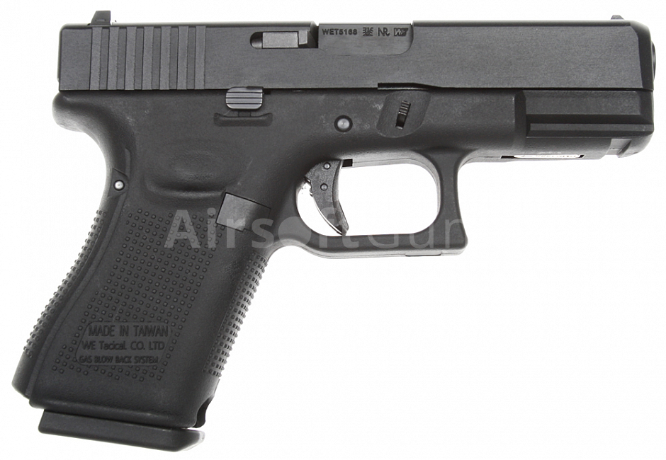 Plynová airsoftová zbraň se systémem Blow Back. Replika modelu Glock 19 GEN.5 [WE-G003VB-BK] s černým polymerovým rámem a kovovým závěrem od firmy WE. G19 je kompaktnější model konstrukčně vycházející ze základní varianty full-size pistole G17.Nákupem tohoto produktu získáte 23 kreditů.