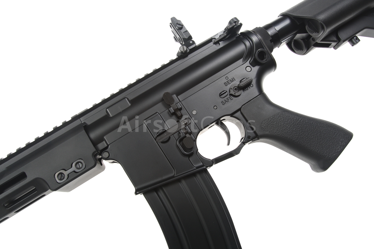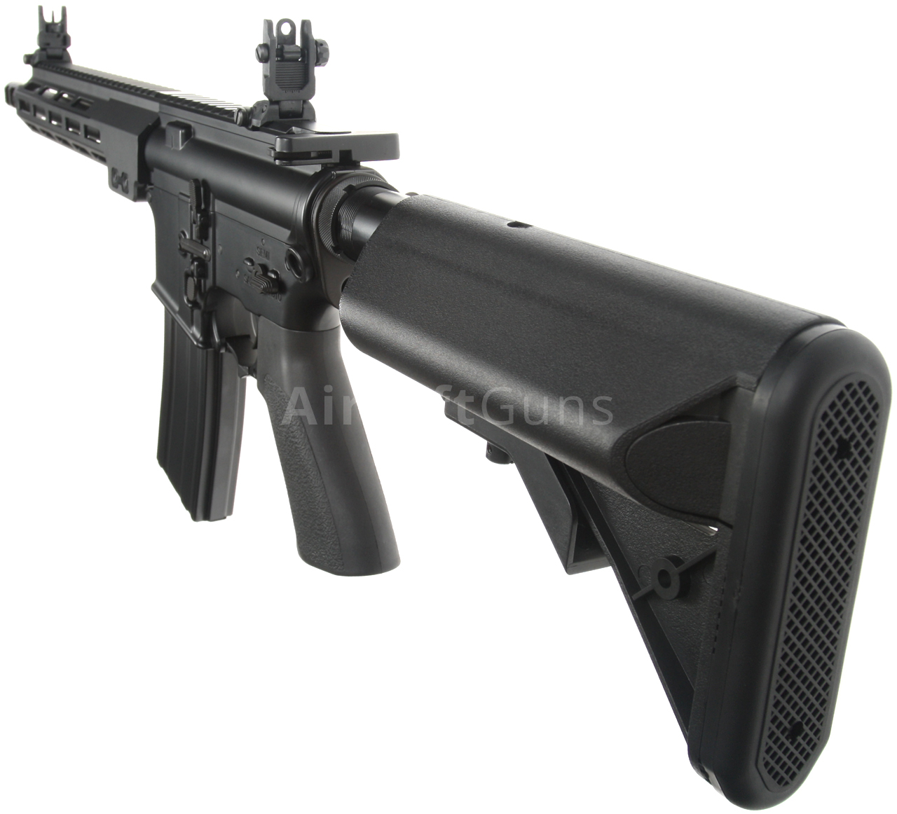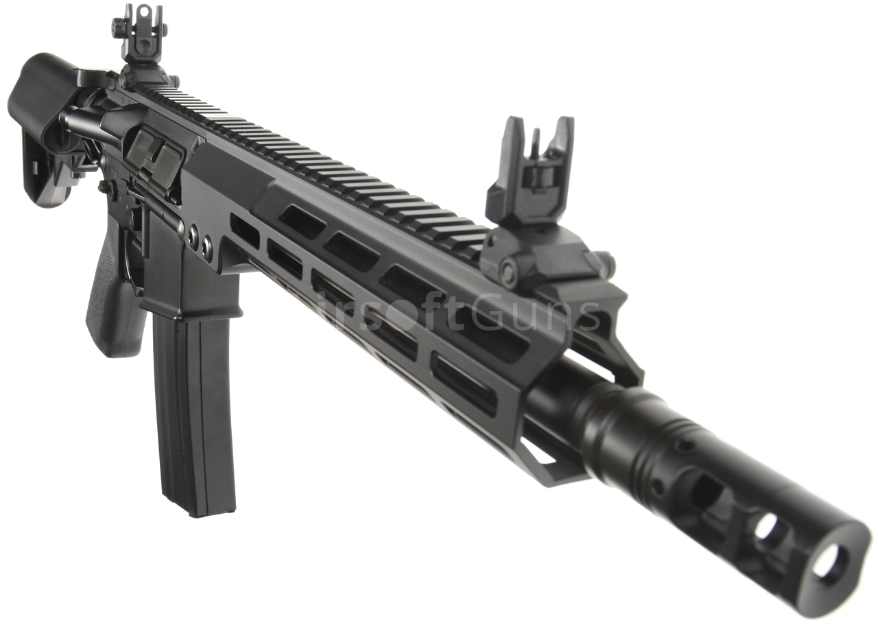 Zbraň je vybavena teleskopicky zásuvnou pažbou Crane Stock, která nabízí 6 poloh délkového nastavení a umožňuje vložení doporučeného typu LiPol baterie. Kovová vnější hlaveň je osazena robustním kovovým kompenzátorem, který je našroubovaný na 14 mm levotočivém závitu.