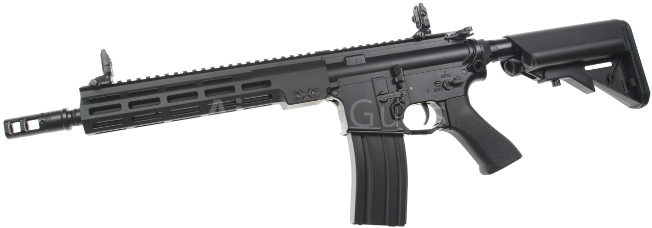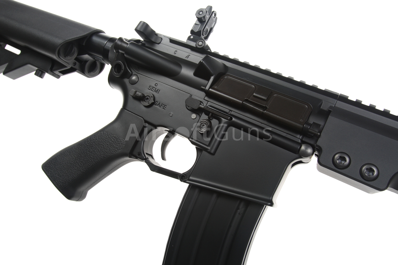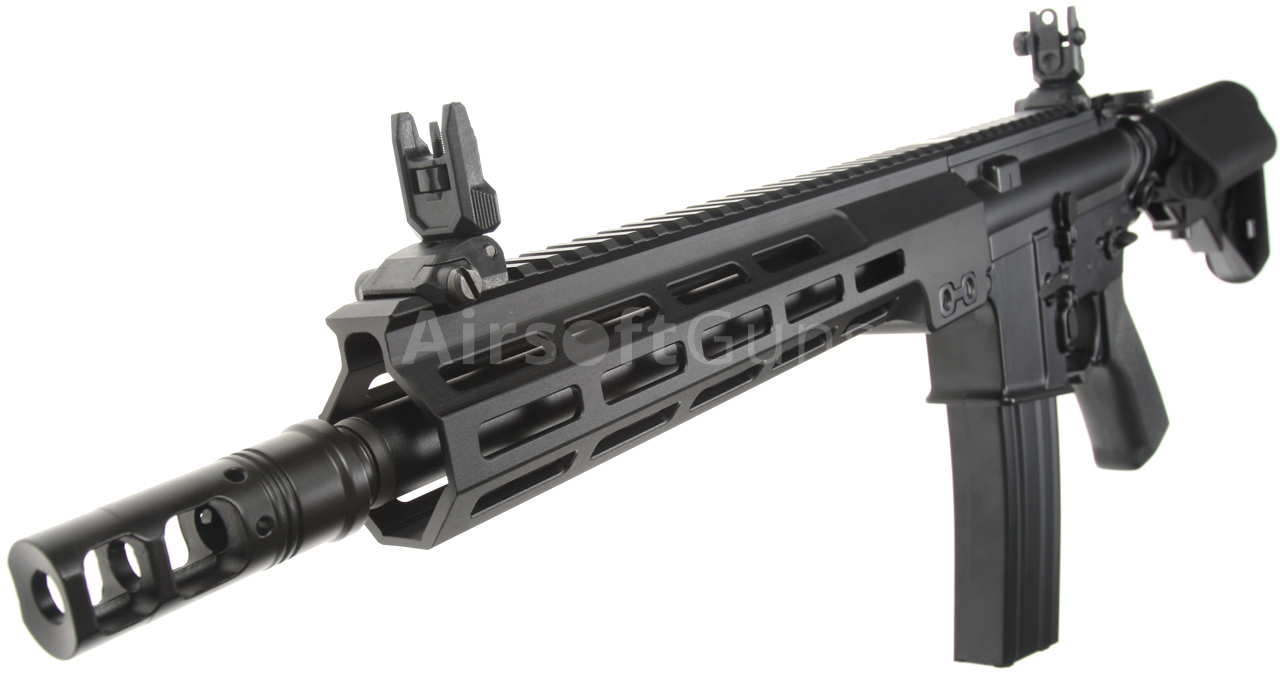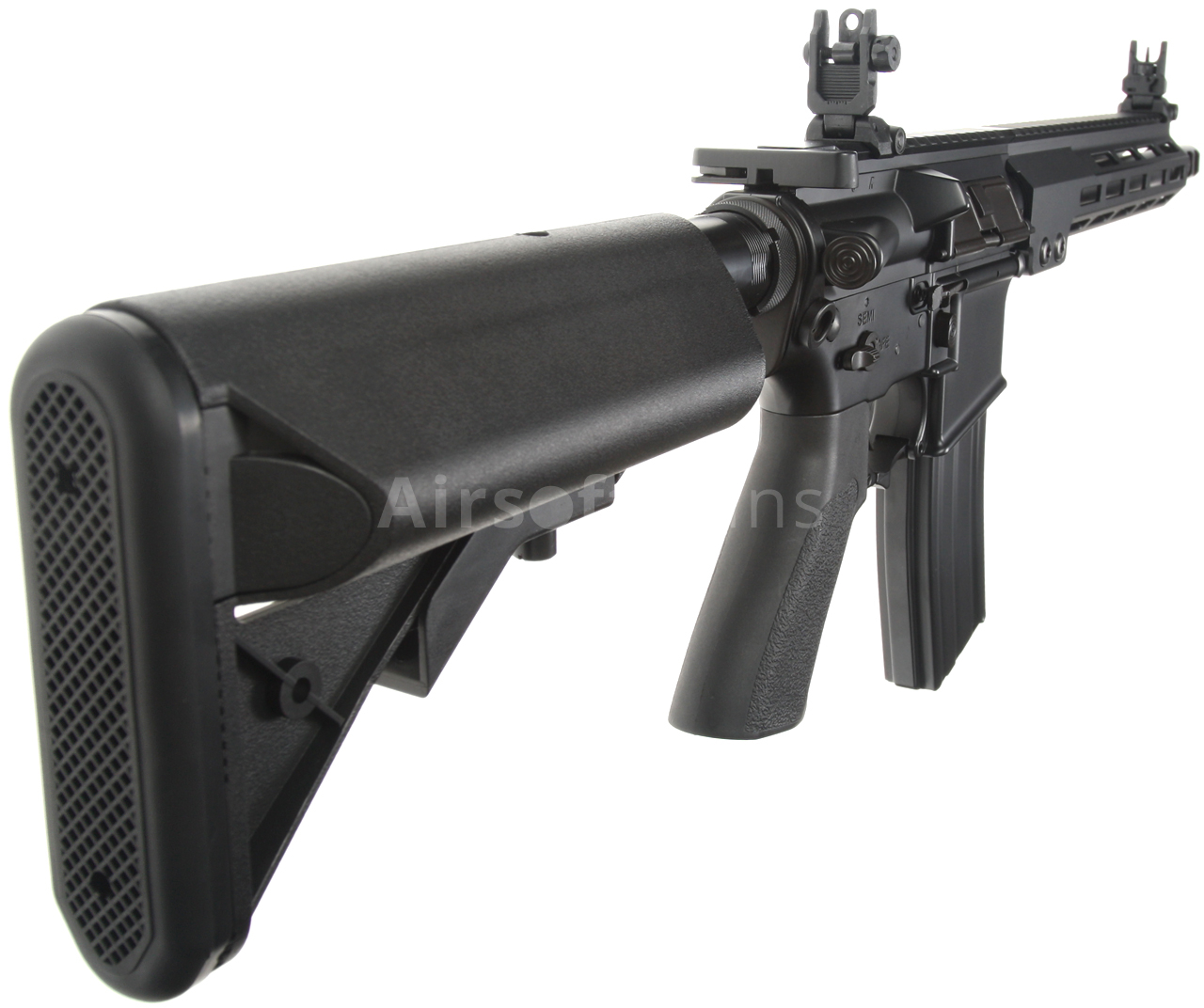Zbraň je vybavena teleskopicky zásuvnou pažbou Crane Stock, která nabízí 6 poloh délkového nastavení a umožňuje vložení doporučeného typu LiPol baterie. Kovová vnější hlaveň je osazena robustním kovovým kompenzátorem, který je našroubovaný na 14 mm levotočivém závitu.
