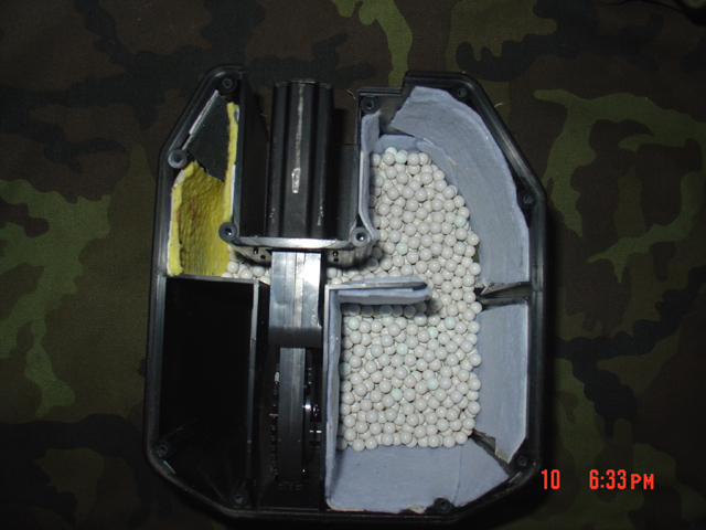Opravdu primitivní je princip, na kterém zásobník funguje. Je to vlastně 300 ranný Točák, daný do velké krabice. Zásobník se dělí na primární a sekundární komoru. Z primární jdou kule přímo do točáku a ze sekundární se přesypávají do primární otočnými dvířky.