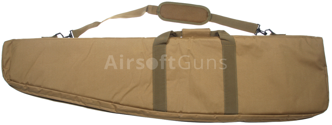 Přepravní pouzdro 9.11 Tactical na zbraň do délky 117 cm. Tvarovaná molitanová vložka zaručuje optimální ochranu zbraně při přepravě i uskladnění. Pouzdro lze nosit na odnímatelném popruhu přes rameno, nebo za madlo v ruce. Na boční straně má čtyři kapsy na zásobníky a jednu delší na zip pro uložení dalších drobností. Šířka položeného pouzdra je 30 cm, takže umožňuje ponechání zaměřovače a dalších doplňků osazených na zbrani. Přední třetina se postupně v místě hlavně/tlumiče zužuje až na necelých 20 cm. Vyrobeno z nylonu 600D v pískovém barevném provedení TAN.