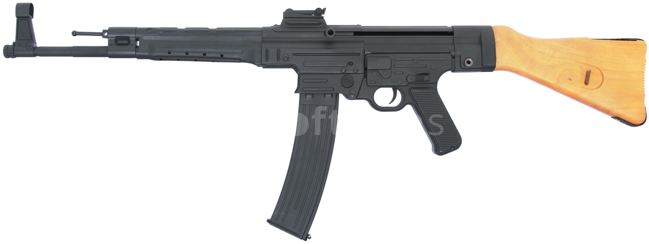 Elektrická airsoftová zbraň. Replika modelu STG44/MP44.Elektrická airsoftová zbraň. Replika modelu STG44/MP44 v celokovovém provedení a pažbou ze dřeva. Ve zbrani je kovový mechabox se zesílenou hlavou válce, protitlakou hlavou pístu a ocelovými koly. Součástí balení je nabíječka, akumulátor 8,4V/1200 mAh (malý konektor), vytěrák a vysokokapacitní zásobník na 550 BB.
