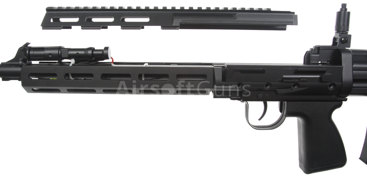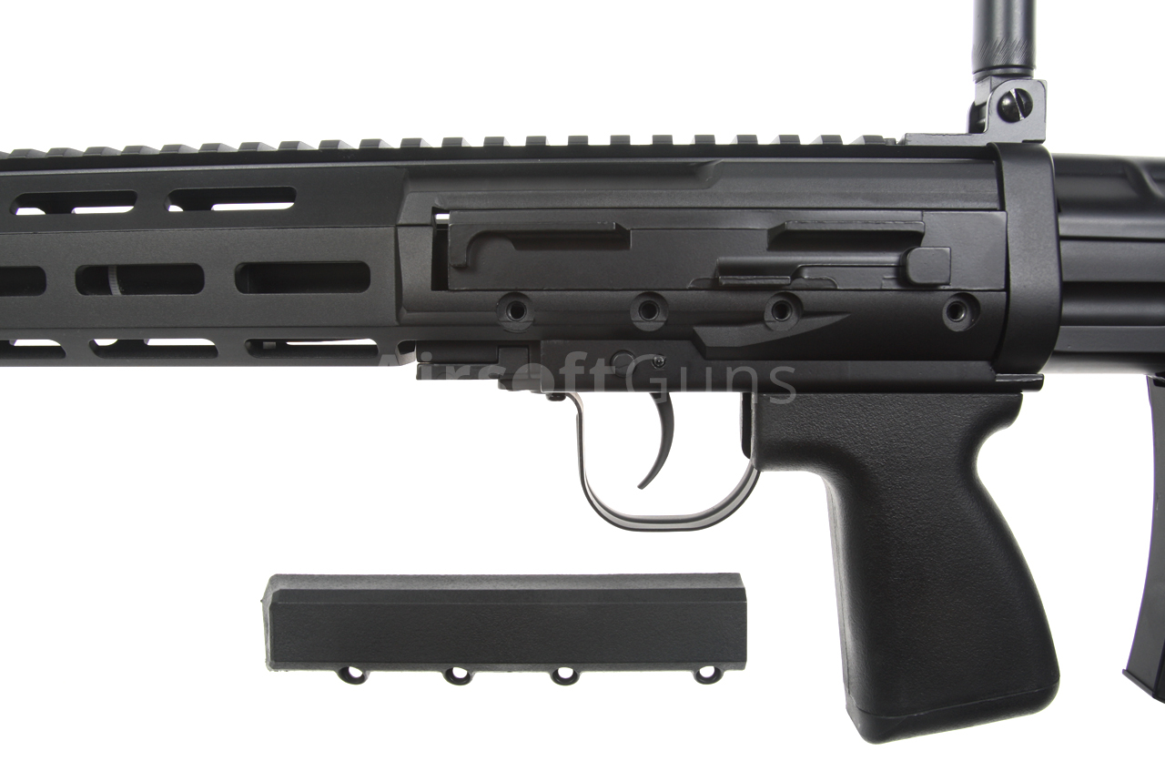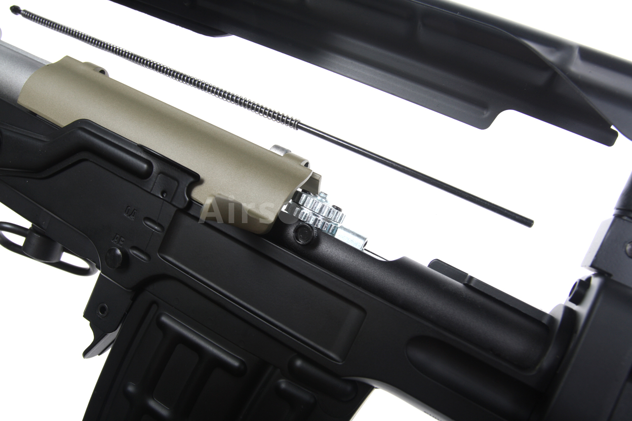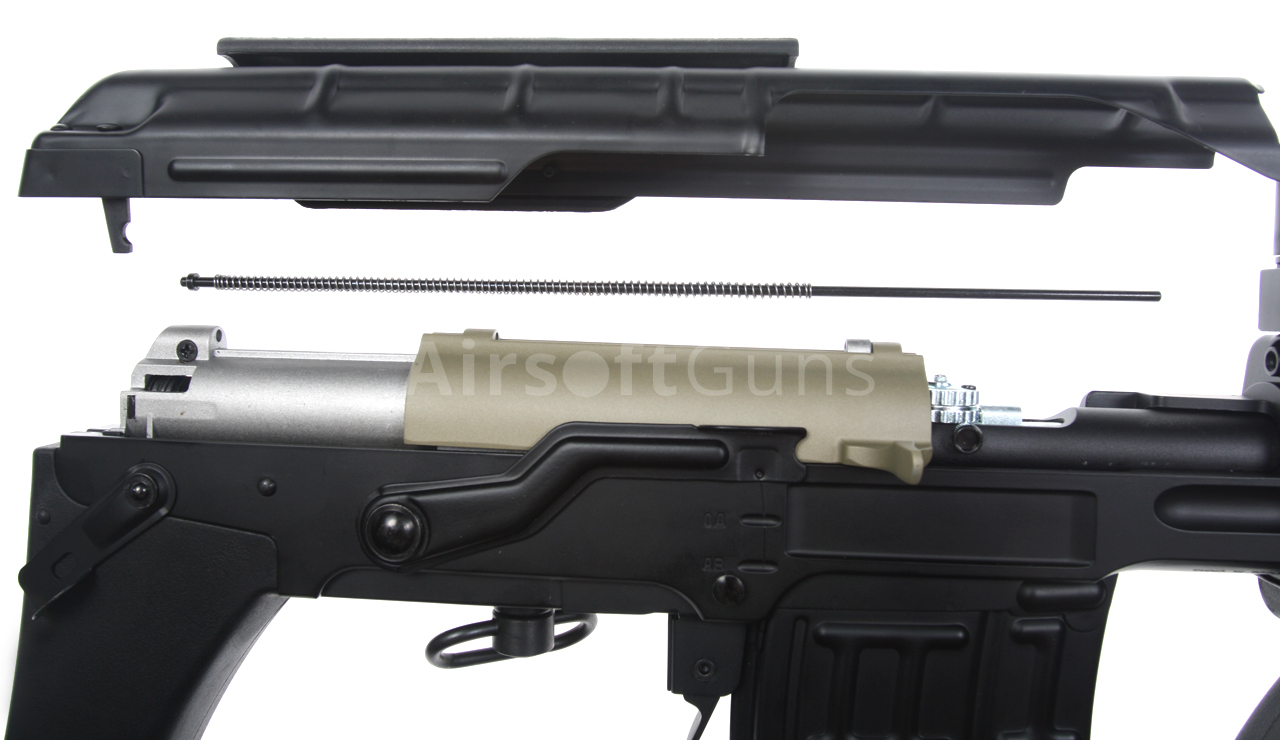 Kovový zesílený mechabox obsahuje čtyři ocelová kola, precizní kluzná 7 mm ložiska (cross slot), pružinu na úrovni M120 + podložku v pístu (poloviční ozubení), rotační vodič pružiny s ložiskem, zesílenou hlavu válce a protitlakou hlavu pístu. Kovová Hop-Up komora má přesnou regulaci typu TDC. Součástí balení je vytěrák a vysokokapacitní zásobník na 120 BB (Hicap).