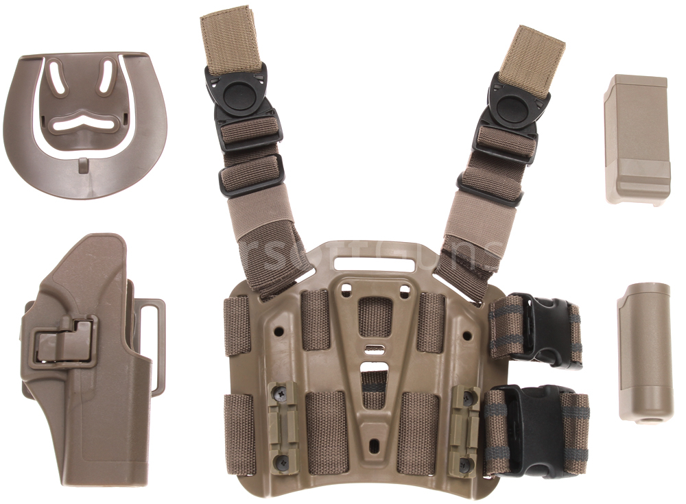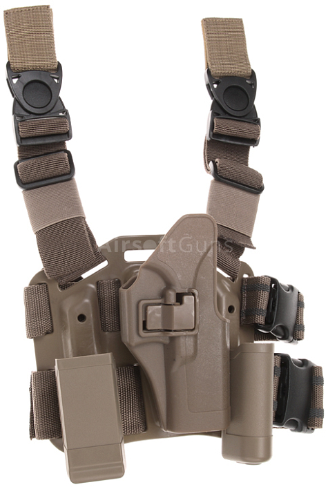 Taktické pouzdro GLOCK CQC ve stylu provedení BLACKHAWK v barevném odstínu Flat Dark Earth. Pouzdro lze nosit na stehenním panelu, opasku nebo pomocí pádla za opaskem. Fixace pouzdra na noze se provádí pomocí stavitelných VELCRO pásků a stahovacích popruhů. Součástí balení jsou i plastová pouzdra na zásobník a svítilnu.
