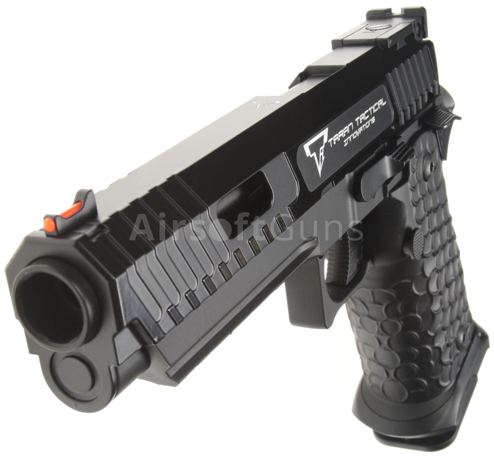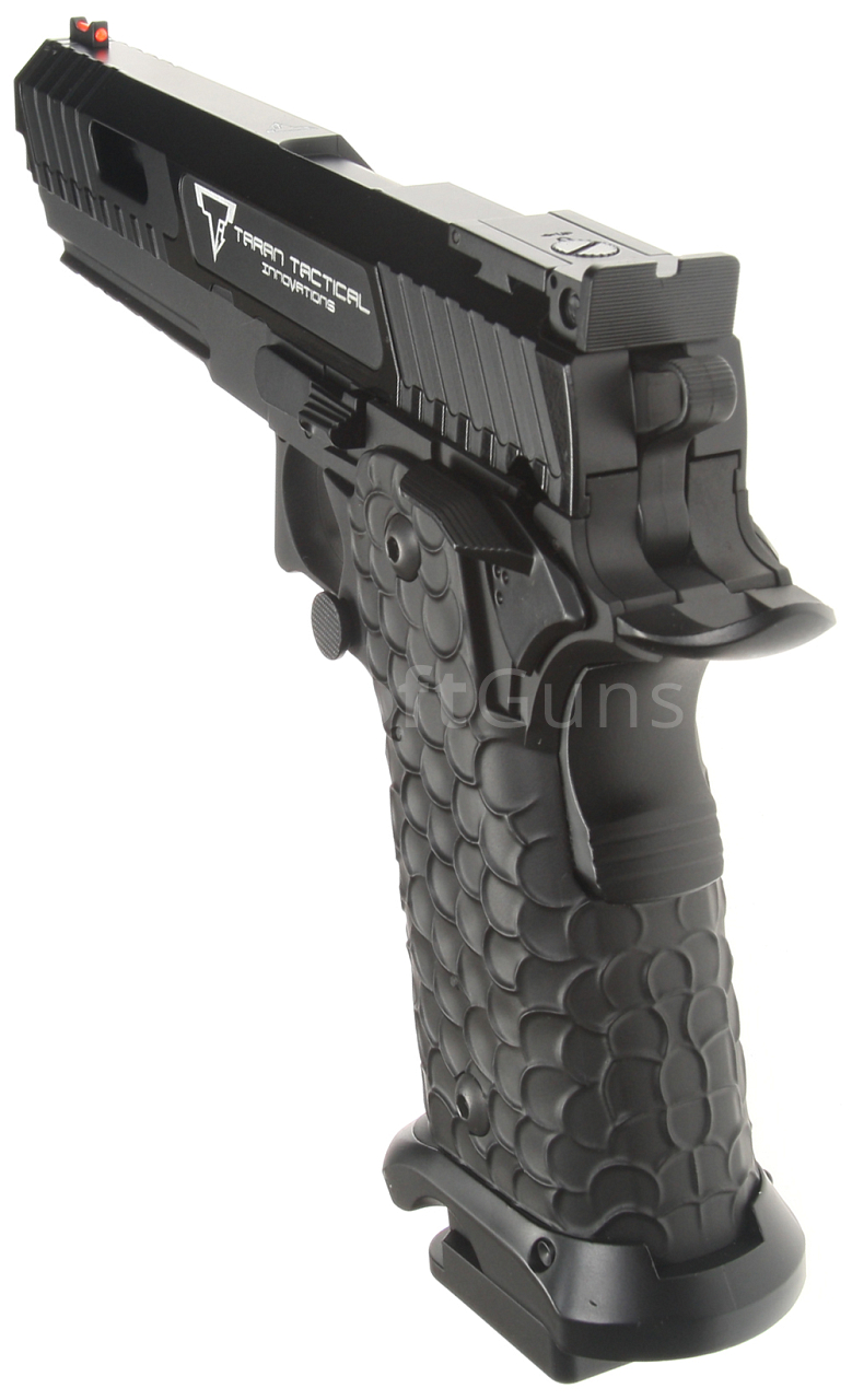 Více informacíTTI JW3 Combat Master AEP, mosfet, Black, Cyma, CM.138. Elektrická airsoftová zbraň AEP. Replika modelu pistole TTI JW3 Combat Master [CM.138] od firmy Cyma s mosfet spínáním a kovovým závěrem v černé barvě. Zbraň je vyráběna v licenci Taran Tactical Innovations (TTI) a je inspirována filmem John Wick 3. Kovový závěr je opatřen originální ražbou a značením, vše licencováno EMG. Zbraň je vybavena RIS lištou na spodní straně rámu. Přední mířidlo je osazeno světlovodným vláknem pro lepší míření za horších světelných podmínek. Jedná se o upgradovanou pistoli AEP, která obsahuje moderní elektronické spínání pomocí mosfetu. Toto řešení zajistí vyšší životnost spínacích kontaktů a umožní lepší průtok proudu obvodem. Upgrade verze pistole byla dále vylepšena o ocelová kuličková ložiska a nízko odporovou kabeláž. Tyto modifikace, společně s LiPol baterií, zajistí rychlou odezvu a rychlý výstřel při stisknutí spouště. Dále pak poskytnou vyšší kadenci střelby a větší počet nastřílených ran na jedno nabití baterie, než modely s NiMH baterií.