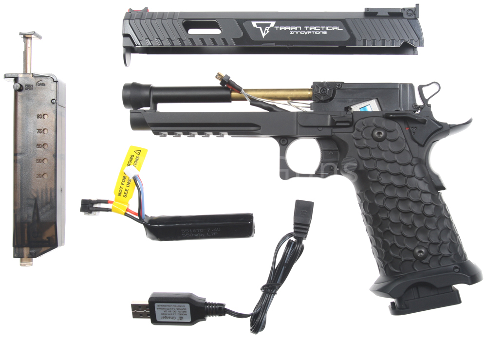 Součástí balení je USB LiPol 7,4V nabíječka, akumulátor LiPol 7,4V/500 mAh, rychloplnička, vytěrák a zásobník na 36 BB. Do zbraně lze použít zásobníky určené pro zbraň HI-CAPA 5.1 AEP s kapacitou 36 BB.